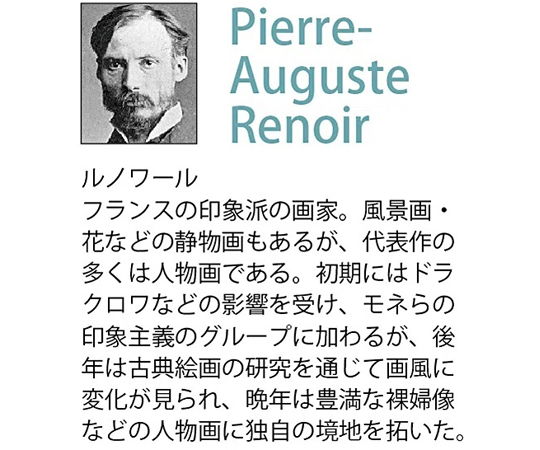 ●絵の表面を特殊ゲル加工しているため、油絵のような質感です。●サイズ:W109×H44×D3.5cm●重さ:約2.4kg●作家:ルノワール(フランス男性作家)●※作家の詳細フランスの印象派の画家。風景画・花などの静物画もあるが、代表作の多くは人物画である。初期にはドラクロワなどの影響を受け、モネらの印象主義のグループに加わるが、後年は古典絵画の研究を通じて画風に変化が見られ、晩年は豊満な裸婦像などの人物画に独自の境地を拓いた。●材質:樹脂フレーム●絵の表面を特殊ゲル加工●生産国:日本