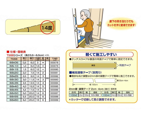 ●発泡EVA製すべり止め●段差解消スロープ●角部屋や廊下・勝手口など狭い出入口に適しています。●柔軟性の高いスロープで狭い場所向き!●廊下の突き当たりでも加工せずに使用できます!●※両面テープは2本貼付け済み。●軽くて施工しやすい●裏面の両面テープで簡単に固定できます。●別売り調整テープ●高さ調整は別売りの調整テープを重ねて簡単に施工できます。●※カッターで切断して長さ調整できます。●色は日本家屋にマッチするライトブラウンです。●材質:発泡EVA(酢酸ビニル樹脂)●幅×奥行×高さ:680×115×30mm●勾配度数:14°●溝本数:3●両面テープ付き(底面2本貼付済)