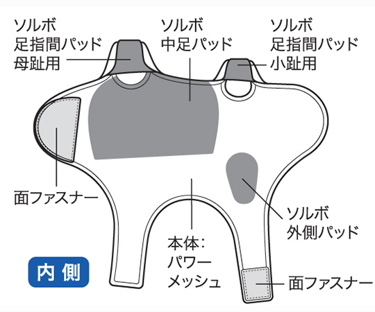 ●外反母趾・内反小趾をスムーズに強力補整する足裏ヨコアーチサポーター●親指・小指の曲がりが気になる・指の付け根が痛い・タコやウオノメが痛い方へ●粘弾性が有り、衝撃吸収性が高い「ソルボセイン」を使用●ソルボパッドが母趾・小趾を開かせ、親指の付け根と足底への衝撃を吸収します。●素材:本体/ナイロン・ポリウレタン、パッド/ポリウレタン樹脂(ソルボセイン)
