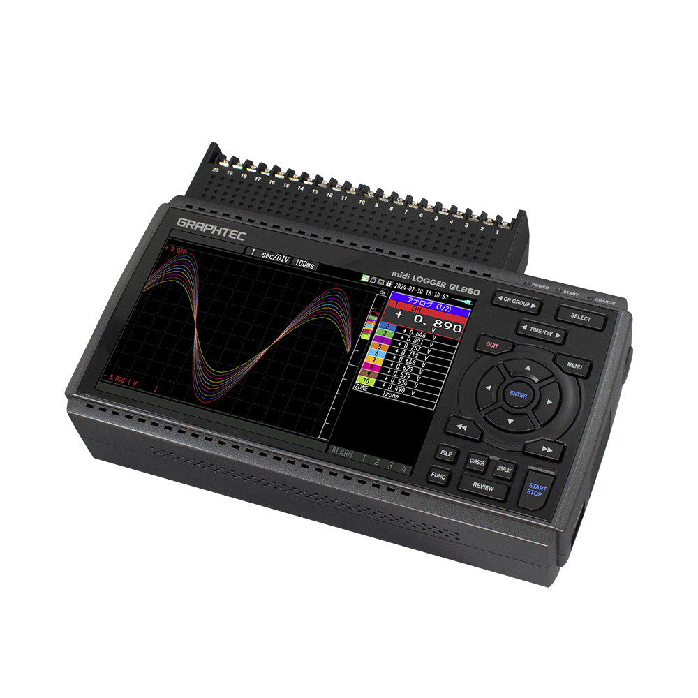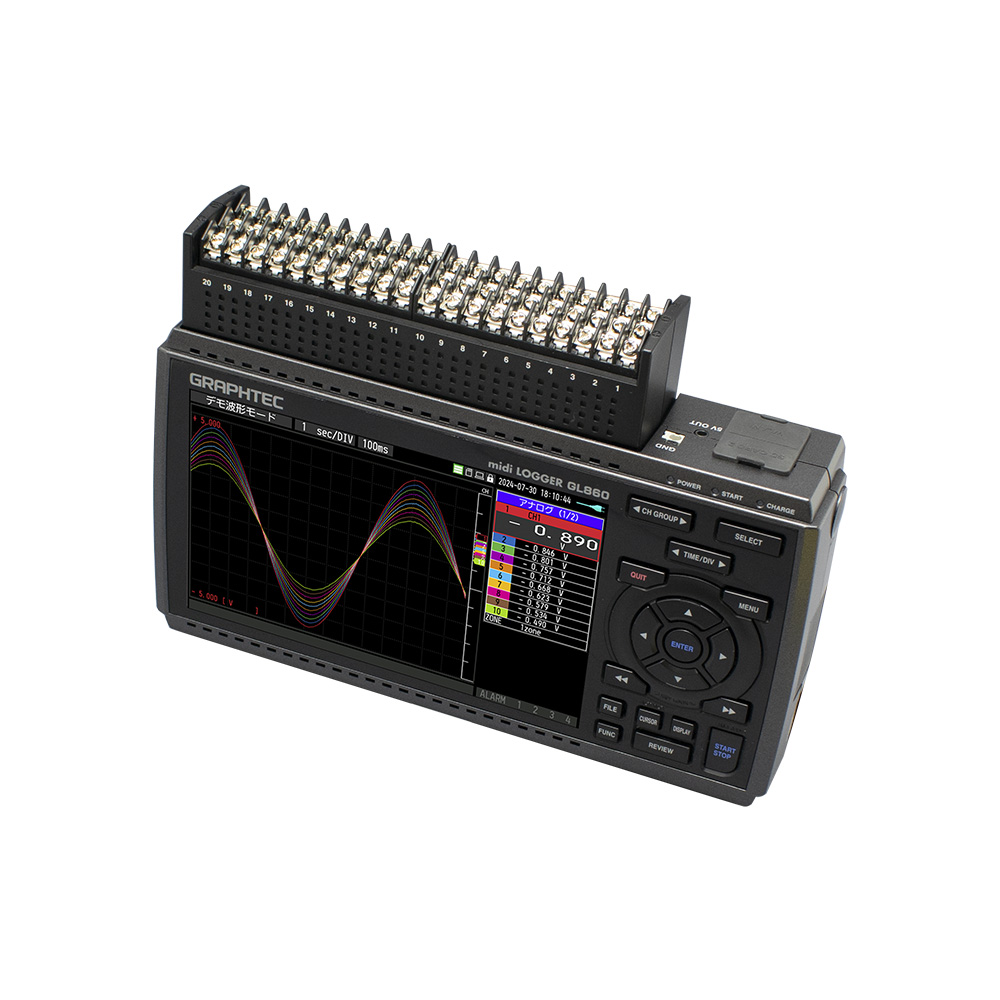 ●GL840-WV、GL840-SDWVの後継商品です。本体メモリは取り出し不可となります。●電圧・温度・湿度(湿度は1チャネルのみ)を計20チャネルのデータ取得ができます。●イーサネット、USBインターフェース付きでパソコンに接続が可能です。●オプションで無線LANユニット(B-568)を装着できます。(オプションのSD メモリカードと同時装着不可能)●測温抵抗体(三線式のみ)による温度測定が可能です。●サイズ(mm):約240×166×52.5●重量(g):約1035●測定範囲:電圧/20・50・100・200・500mV・1・2・5・10・20・50V、100V、1-5V/F.S.、温度/熱電対K、T他、測温抵抗体(※3線式のみ)Pt100、JPt100、Pt1000(IEC751)、湿度/0~100%(オプション:B-530必要)●入力チャンネル:20ch・M3ねじ式端子、ロジック入力4chまたはパルス入力4ch ※GL用入出力ケーブル(B-513)が必要です。●サンプリング周期:5ms~1h(5~50msは電圧のみ、サンプリング周期によりch制限あり)●全CH絶縁入力●内蔵メモリ:SD1約8GB(内蔵固定化)※収録ファイルは1ファイル2GBまで●表示内容:アナログ波形・測定中の過去データ表示・デジタル値●対応OS:Windows11/10●電源:AC100~240V 50/60Hz(ACアダプタ付属)またはDC入力 DC8.5~24V(オプション:B-514必要)●※バッテリーパック(B-573)はオプションです。