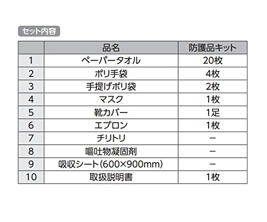●いざという時の備蓄に!●コスパの高い処理キットです。●感染対策として最適です。●嘔吐処理時に必要なものが揃った対策キットです。●1人分をコンパクトにまとめました。●防護品キット●入数:1セット●セット内容●▼ペーパータオル:20枚●▼ポリ手袋:4枚●▼手提げポリ袋:2枚●▼マスク:1枚●▼靴カバー(ショート):1足●▼エプロン:1枚●▼取扱説明書:1枚