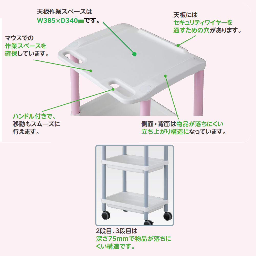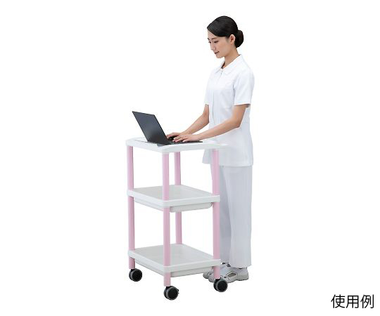 ●プラスチック製のPCカートです。●樹脂製カートなので、軽量で軽く搬送することができます。●天板・トレーはPP(ポリプロピレン)製ですので、耐薬品性に優れています。●軽量で頑丈な設計の、使い勝手の良いプラスチックPCカートです。●天板は滑り止め加工でパソコンが滑りにくくなっています。●Point1:操作性に優れた軽量設計●Point2:用途・目的に応じて選べる多種多様なラインナップ●お求めやすいプラスチック製PCカートができました!●天板や棚板が樹脂の一体成形なので、清拭しやすく、清潔に保つことができます。●工具を使わずに組み立て・分解が容易にできます。●カラー:ピンク●入数:1個●材質:天板・棚板/PP(ポリプロピレン)、支柱/ABS樹脂●キャスター:Φ75mmエラストマー製(双輪・2輪ストッパー付き)●棚板有効サイズ:438×279×75mm●サイズ:532×445×880mm●棚板間隔:上段300mm・下段365mm●耐荷重:10kg/段(均等荷重)●重量:約6.5kg●組み立て式