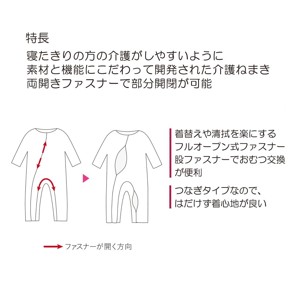 ●胃ろう・尿管用カテーテル等を付けたままでも介護のしやすい両開きファスナータイプです。●胸元から右足首へのフルオープンファスナーと股部分のファスナーにより、着脱が容易です。●背中に縫い目がないので、違和感なく着用いただけます。●床ずれの原因となる肌への刺激が軽減されます。●男女兼用●仕様:スリーシーズン●色:グリーン●サイズ:L●素材:ポリエステル65%・綿35%●洗濯方法:洗濯可(弱・40℃)/脱水可/乾燥機可(家庭用のみ)●※洗濯時には必ず面ファスナー・ファスナー・ホックを閉じてください。●※ソフトケア(R)ねまきは、おむつ・おむつカバーを使用して着用することを想定しています。