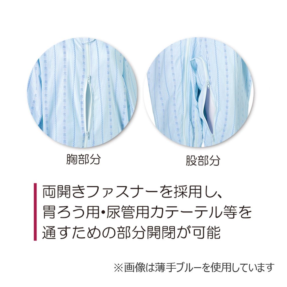 ●胃ろう・尿管用カテーテル等を付けたままでも介護のしやすい両開きファスナータイプです。●胸元から右足首へのフルオープンファスナーと股部分のファスナーにより、着脱が容易です。●背中に縫い目がないので、違和感なく着用いただけます。●床ずれの原因となる肌への刺激が軽減されます。●男女兼用●仕様:スリーシーズン●色:グリーン●サイズ:LL●素材:ポリエステル65%・綿35%●洗濯方法:洗濯可(弱・40℃)/脱水可/乾燥機可(家庭用のみ)●※洗濯時には必ず面ファスナー・ファスナー・ホックを閉じてください。●※ソフトケア(R)ねまきは、おむつ・おむつカバーを使用して着用することを想定しています。