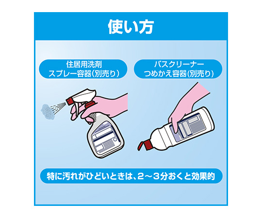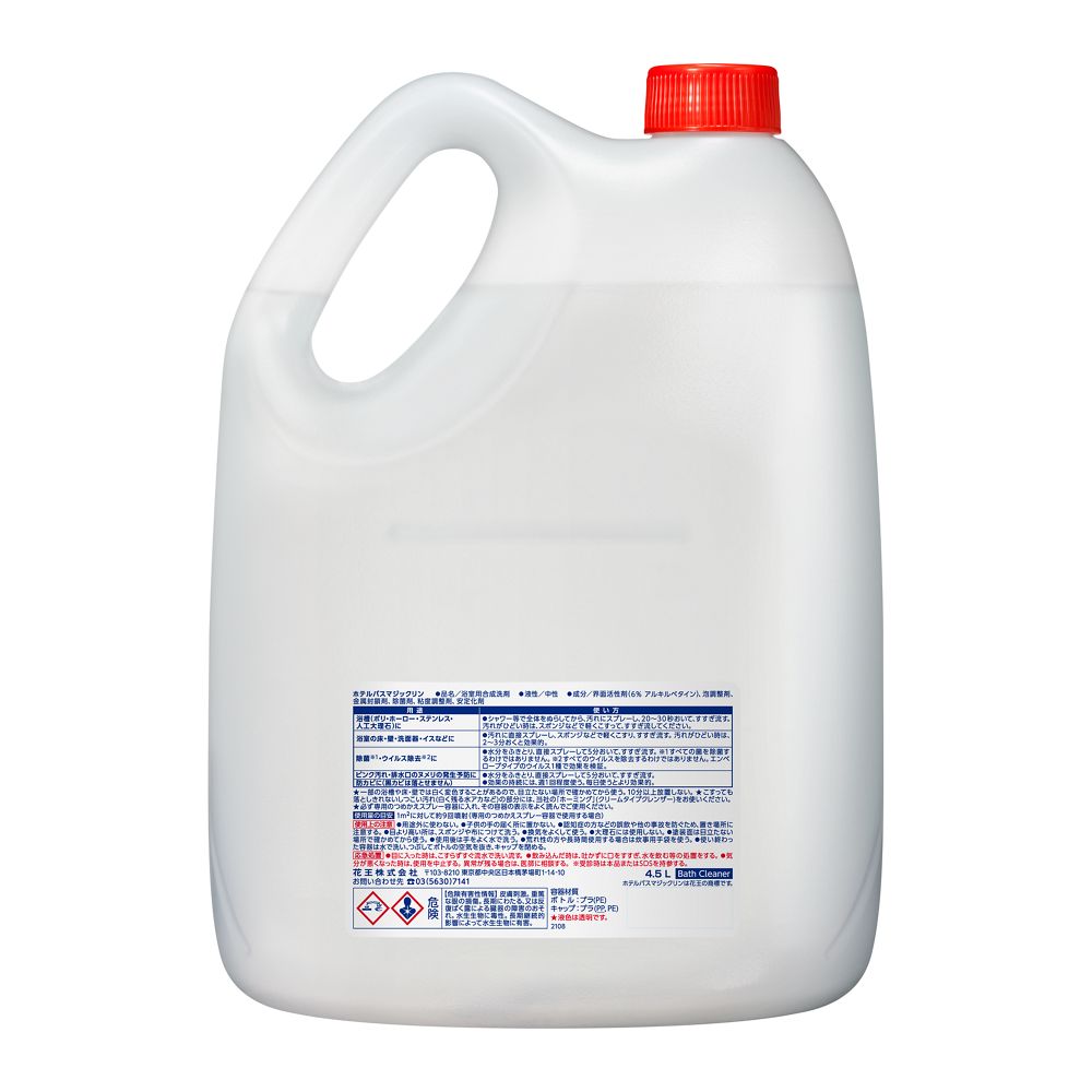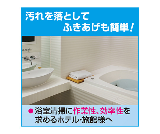 ●水切れ成分を配合しているので、ふきあげ作業が簡単です。●壁やカーテンなどに水滴を残さないので、カビを生えにくくする効果があります。(防カビ効果)●中性タイプ。●除菌成分配合。※すべての菌を除菌するわけではありません。●※別売りの「設備洗浄剤業務用つめかえスプレー容器」(61-8509-78)につめかえてご使用ください。●液性:中性●成分:界面活性剤(6% アルキルベタイン)、泡調整剤、金属封鎖剤●用途:浴槽(ポリ・ホーロー・ステンレス・人工大理石)、浴室の床、壁、洗面器、イス、洗面台●タイプ:スピード清掃・除菌●容量:4.5L