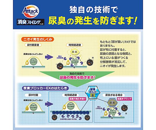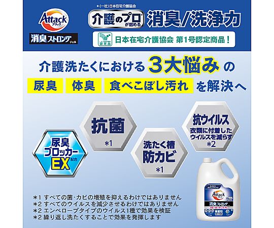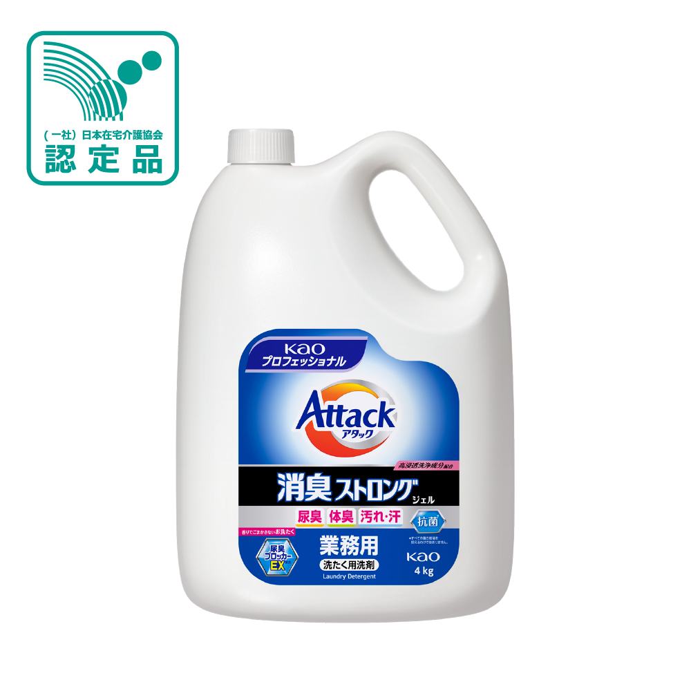 ●〔洗たく用洗剤〕尿臭の発生を抑える「尿臭ブロッカーEX」に加え食べ残し汚れへの洗浄力upのアミラーゼを配合!しみついた尿臭・体臭・食べ残し汚れを解決!●香りでごまかさないお洗たく ●抗菌※●高浸透洗浄成分配合●肌着・下着・ズボン・シーツなどのお洗たくにおすすめ。●※すべての菌の増殖を抑えるわけではありません。●※計量の際には、別売りの「Kao業務用ボトル専用計量キャップ」(62-3785-14)をご利用になれます。●内容量:4kg●使用量の目安:水30Lに対して30mL(キャップ1杯と1/2杯)※キャップ1杯20mL●液性:弱アルカリ性●成分:界面活性剤、安定化剤、pH調整剤、酵素、蛍光増白剤●用途:綿・麻・合成繊維用