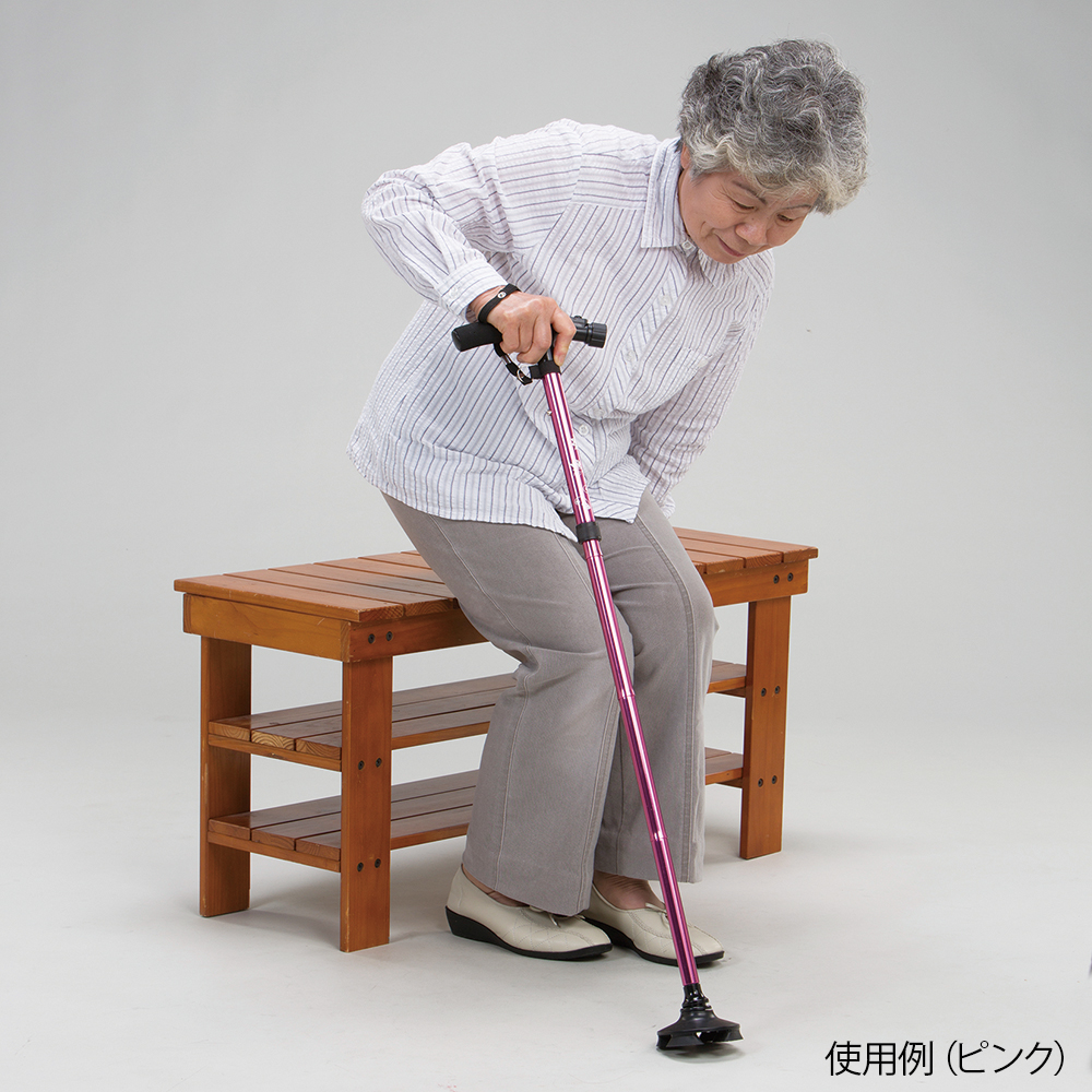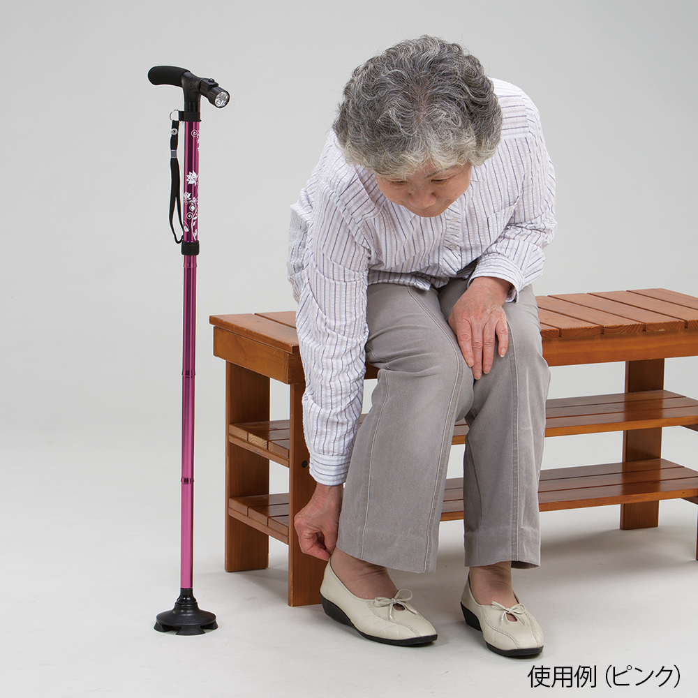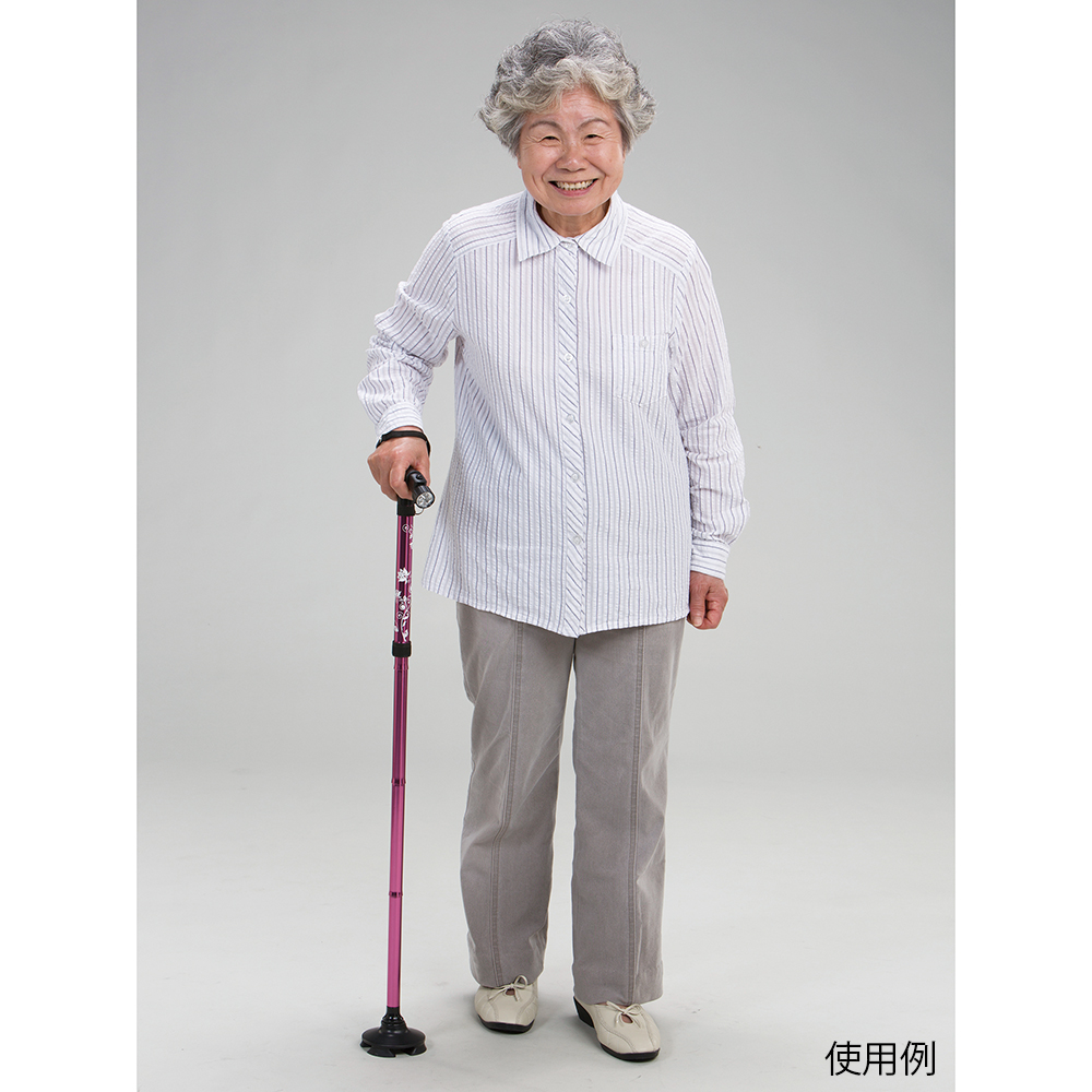 ●暗い場所でも安心なLEDライト付きです。●杖先が足首のように可動し、スムーズな歩行を補助します。●型番:2029-056●色:ピンク●材質:アルミ・ABS樹脂●全長:770~890mm(22mm間隔・5段階調節)●脚サイズ:98×98mm●重量:約420g●脚先端部径:Φ20mm●電源:LR44ボタン電池×4個(テスト用付属)●付属品:収納袋