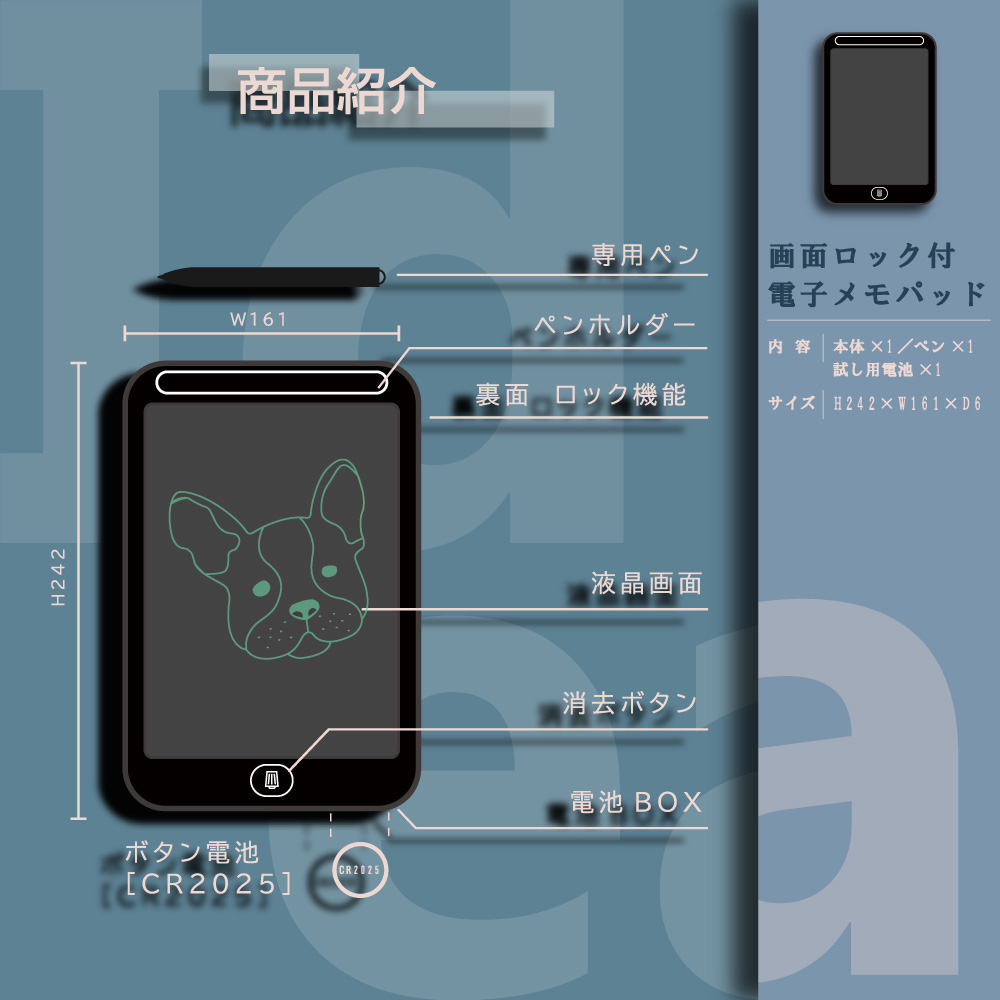 ●インクを使用せず何度でも書き消しが可能です(ワンタッチ消去が可能)。●筆圧で文字の太さを変えながらスイスイ書けます。●スイッチ機能で誤った消去を防止します。●ペーパーレスで環境にやさしいです。●色:白色●★入数:1個●サイズ:161×242×6mm●重量:165g●画面サイズ:10インチ●画面ロック機能付き●電源:ボタン電池CR2025×1個(テスト品付属)●付属品:専用ペン×1本