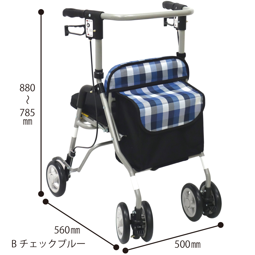 ●幅50cmとコンパクトで軽量です。折りたたみ可能です。●握ればブレーキ、下に押しさげると駐車ストッパーの2WAYブレーキです。●柄:Bチェックブルー●サイズ(mm):500×560×785~880●材質:本体/アルミ、タイヤ/EVA(硬質発泡車輪)、バッグ/ポリエステル●重量:5.9kg●高さ調節:4段階(ピッチサイズ30mm)●座面高:410mm●耐荷重:100kg●キャスター:Φ145mm 2WAY(固定、左右各60度)●2WAYブレーキ