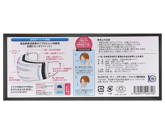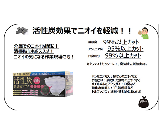 ●強力活性炭フィルターを採用した4層マスクです。●介護、清掃、DIY等、ニオイの気になる場面で、気軽に使用できる使い捨てマスクです。●口側吸水性不織布で、呼気を吸収しムレを軽減します。●花粉やウイルス飛沫を99%カット。感染対策にも使用できます。●対象:風邪・花粉・ほこり、口臭成分・酢酸臭やアンモニア臭など●マスクサイズ:約175×95(mm)●材質:本体/PP(ポリプロピレン)不織布・活性炭フィルタ、耳ひも/ポリエステル・スパンデックス、ノーズフィットワイヤー/PE(ポリエチレン)●4層構造(外側より):撥水性不織布→高品質フィルター→活性炭入り高性能消臭フィルター→吸水性不織布●BFE≧99%以上、PFE≧99%以上●入数:1箱(1枚/袋×30袋入)●ケース入数量:50箱入●※価格は1箱あたりの価格です。