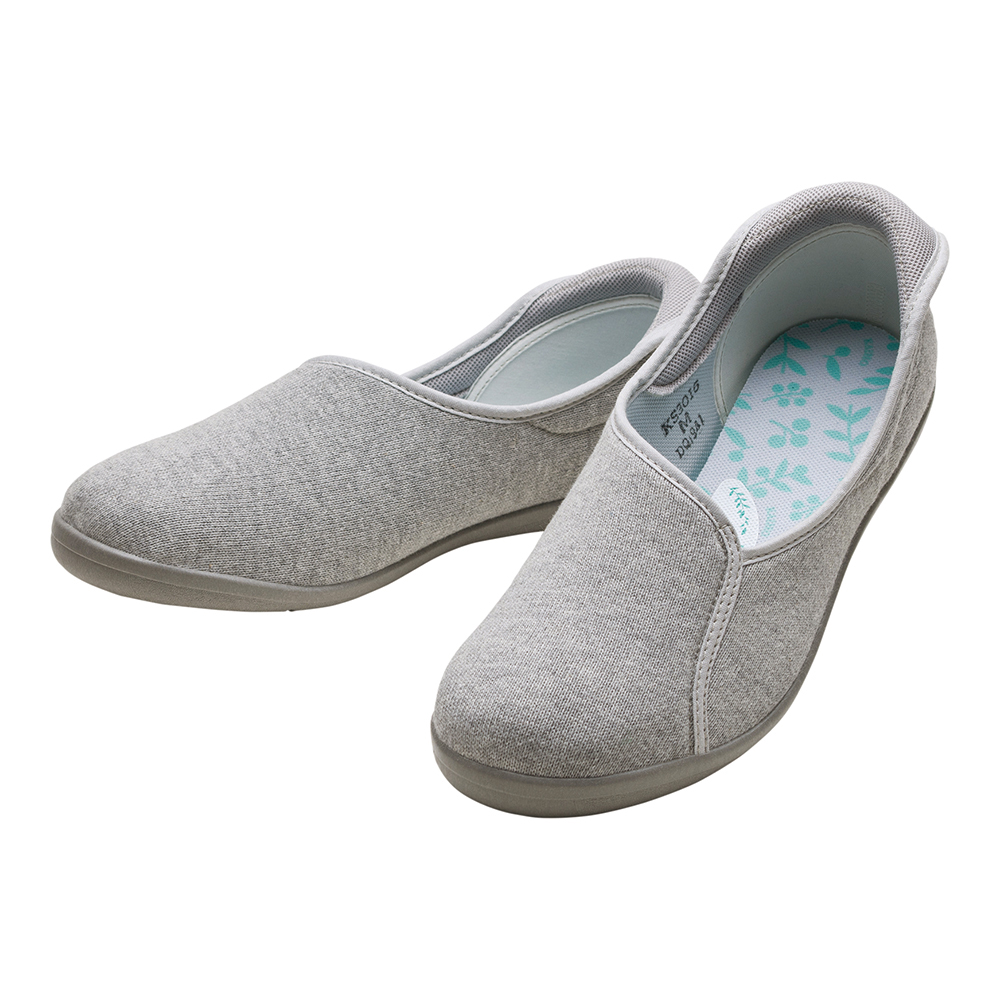 ●つま先・かかとをそり上げた、つまずきにくい設計です。●足入れ時に足指がひっかかりにくく、手を使わなくても履き易い独自デザインの斜めカットです。●かかと部のプルタブは脱ぎ履き時のつまみとしても使用できて便利です。●アッパー表素材は綿100%ニットで、伸縮性がありフィット感の良い3層構造です。●インソールのネーム欄は名前の記入も可能です。●色:グレー●サイズ:S(22.0~22.5cm)●材質:アッパー部/綿、ソール部/合成底(PVC)●足囲:3E(インソールを取り外すと4E相当まで対応)●目安重量:約165g(Mサイズ片足)●やわらかく屈曲する独自配合ソール●丸洗い可●制菌加工(裏材)・抗菌防臭加工(インソール)●婦人用