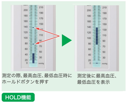 ●水銀不使用の、環境に配慮した水銀レス血圧計です。●ディスプレイはバックライト付きのため表示が見やすいです。●最高血圧と最低血圧をホールドボタンを押すことで保持できます。●専用ACアダプターによる給電も可能です(本体セットには付属しておりません)。●角度調整機能とバックライトを備えた見やすさを追求した設計です。●従来の水銀血圧計と同様の測定方法で使用できます。●角度調整が可能なため見やすい角度を選択できます。●持ち手があるため持ち運びに便利です。●オートパワーオフ機能付きです。●送気球、カフセットともに安心のラテックスフリーです。●本体及びカフは耐薬品性※に優れています。●※本体/次亜塩素酸ナトリウム・アルコール、カフ/アルコール●本体とカフはアルコール清拭が可能です。●測定方法:聴診法 ※別途聴診器が必要です。●測定範囲:20~300mmHg●測定精度:±3mmHg●目量:2mmHg●急速排気:302mmHgから15mmHgへの急速排気時間は10秒以下●カフ適応腕周サイズ:220~320mm●電源:単3電池×2本(テスト用付属)または専用ACアダプター(別売)●外寸法:約110×330×71.5mm●本体重量:530g(乾電池を除く)●オートパワーオフ機能:3分●使用環境:気温/5~40℃、湿度/15~93%RH、気圧/700~1060hPa●保管環境:気温/-25~70℃、湿度/10~95%RH●電撃に対する保護の形式による分類:内部電源機器(単3アルカリ乾電池使用)クラスⅡ機器(専用ACアダプター使用時)●電撃に対する保護の程度による装着部の分類:BF形装着部●適合規格:IEC60601-1-2:2014●付属品:ゴム球・カフ(ラテックスフリー)●※一般医療機器です。●別売り・交換部品:交換用カフ(品番:7-6245-11)、交換用ゴム球(品番:7-6245-12)、専用ACアダプター(品番:7-6245-13)