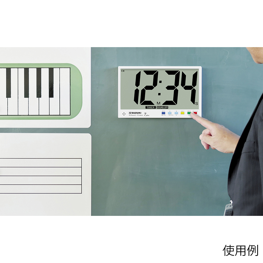 ●教室の後ろからでもしっかり見える!黒板に貼って使える、薄型で大きな表示の時計機能付きタイマーです。●背面マグネット付きで可動式スタンドやフックも付属し、設置場所を選びません。●電池駆動で持ち運びも容易です。どこでも使用できます。●タイマー(リピート機能付き)、時計、ストップウォッチをシンプルに搭載●アラーム音&操作音の「サウンドOFF」が可能●「サウンドOFF」時でもカウントダウン終了を視認できる点滅機能付き●電池残量が少なくなると「電池交換お知らせマーク」が現れ点滅、突然の電池切れを防ぎます。●STEX-06Pと同機能で、サイズの大きいモデルです。●サイズ:235×21×145●重量:420g・電池除く(電池は付属しておりません)●表示方法:LCD可視サイズW220×H115mm●電源:単4電池×2本(アルカリ電池推奨)(2次電池[Ni-MH]でも動作可、別売)●機能:タイマー機能(カウントダウン<リピート機能・点滅機能付>・ストップウォッチ)、アラーム機能、時計機能、サウンドOFF機能(操作音及びアラーム音)、電池交換お知らせマーク●音圧:72dB以上●備考:背面マグネット、可動式スタンド、フック孔付(単4電池別売)