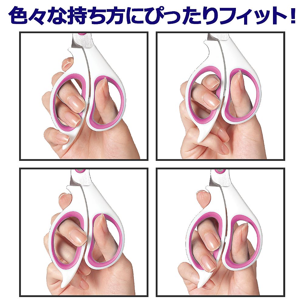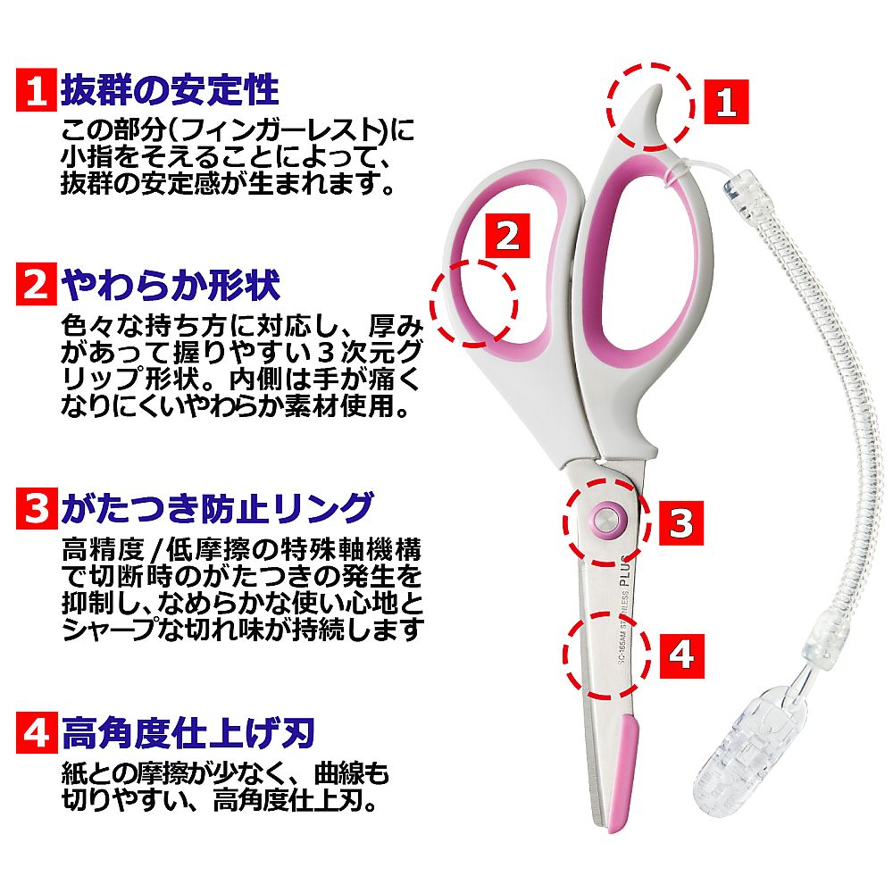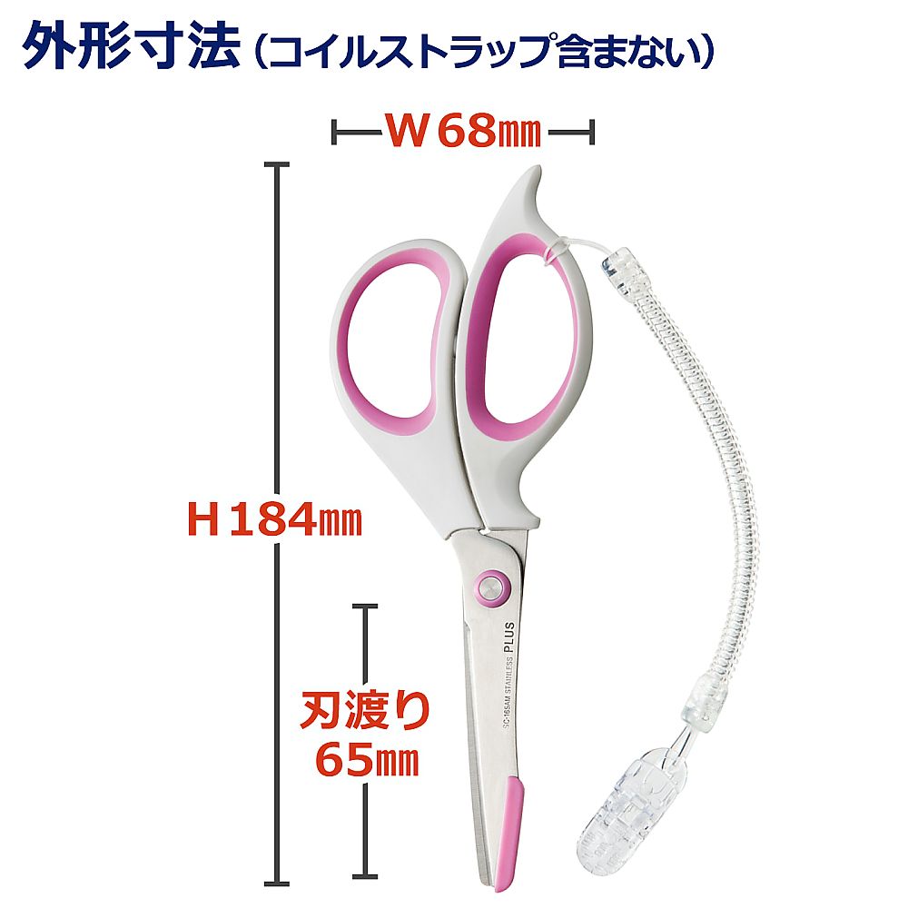 ●刃先は安全ガイド付きで、包帯など肌に密着したものを切るのも安心●がたつき防止リングを搭載しており、シャープな切れ味が持続します。●少し大きめのグリップは、手の大きい方や男性にも使いやすく、いろいろな持ち方にフィットします。●付属のコイルストラップはポケットなどから、はさみの落下を防ぎます。●色:ホワイト/ピンク●材質:グリップ/ABS・TPE、刃/ハイカーボンステンレス鋼、安全ガイド/ABS樹脂、コイルストラップ/TPU・PC(ポリカーボネート)・ポリエステル●サイズ:長さ/184mm、刃渡り/65mm●重量:50g●付属品:コイルストラップ