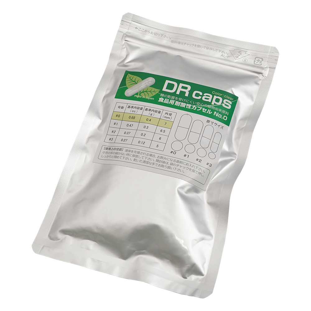 ●胃酸から保護し、腸内までリリースできる耐酸性食品カプセルです。●被膜水分値が低いため、吸湿性の高い製品の充填に適しています。●★乳酸菌などの腸に良い菌や栄養を胃酸から守ります。●★内容物の気になる戻り臭も防げます。●★ボディとキャップのそれぞれに溝・ボッチが施されている為、充填後の分離を防止できます。●サイズ:0号●内容量(g):0.4●内容量(mL):0.68●内径(Φmm):7●重量(1粒あたり):93mg●入数:1袋(100個入)●原材料:ヒドロキシプロピルメチルセルロース●カプセルの基材:HPMC植物由来●色:透明●用途:耐酸性食品や臭いのある食品などの充填
