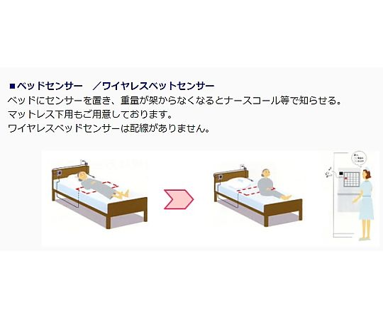 ●ベッドセンサーのコードが無く、一時中断機能付き(1~5分、1分毎に設定可能)、ヒヤリハット件数の多い「スイッチ入れ忘れ」予防に有効です。●寝返り等による誤動作防止機能(反応時間遅延機能)付きです。●2つ折りで保管でき、簡単に無線発信機の電池交換が可能です。●仕様:マットレスの下用●プラグ名称:アイホン3PNF(Aタイプ)●●<ベッドセンサー>●材質:塩化ビニル樹脂(抗菌性)●サイズ:マットレス上用/760×450×16mm、マットレス下用/830×260×16mm●無線発信機電波到達距離:約20m●電源:単4形乾電池×2個(テスト用付属)●電池寿命:約6ヶ月(1日10回反応)●セット内容:ベッドセンサー(無線発信機内蔵)、無線受信機、取り付けホルダー、ナースコール接続アダプター●●<受信機>●サイズ:850×650×25mm●重量:0.85kg●電源:ACアダプター(付属)●室内設置用