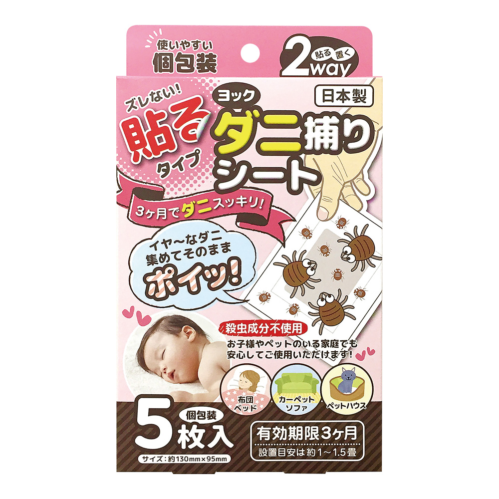 ●約3ヶ月でダニがスッキリ、ズレにくい貼るタイプです。●アレルギーの原因となるダニはもちろん、ダニの糞も飛び散りません。●ダニの捕獲を目的として開発されたビール酵母に誘われたダニがシート本体の中に入るタイプのダニ捕りシートです。●殺虫成分は一切使用しておりません。●ベッド・ふとんなど様々な場所に安心してご使用いただけます。●サイズ(mm):約130×95●入数:1箱(5枚入)●材質:生地/不織布・ビール酵母、粘着剤/アクリル系粘着剤●設置目安:約1~1.5畳●有効期限:約3ヶ月●殺虫成分不使用