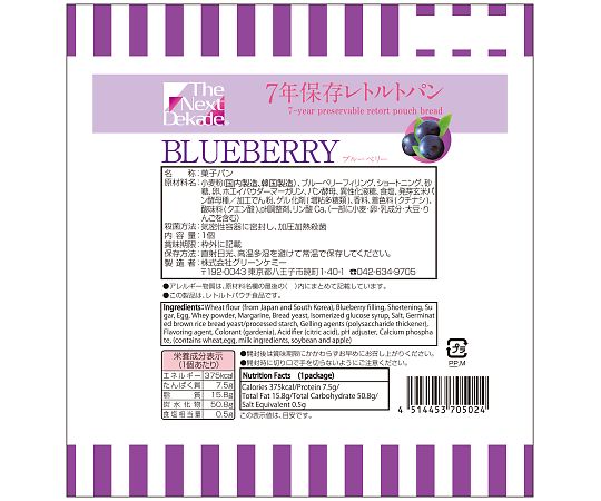 ●調理不要で開けるだけでおいしいパンが食べられます。●ブルーベリー●カロリー(kcal):375●入数:1箱(50袋入)●内容量:100g●原材料:小麦粉、チョコレートペースト((植物油脂、ぶどう糖果糖液糖、砂糖、水飴、カカオマス、ココア、加工でん粉、着色料(カラメル)、香料、増粘多糖類(キサンタンガム、グァーガム、ジェランガム、カロブビーンガム)、pH調整剤(クエン酸三ナトリウム、クエン酸ナトリウム、クエン酸))、砂糖、マーガリン、卵、パン酵母、ぶどう糖、調製粉乳、食塩/乳化剤、ビタミンC、(原材料の一部に小麦、大豆、卵、乳成分を含む)●包材形状:スタンドパウチ●箱サイズ:520×460×200mm●1ケース重量(kg):7
