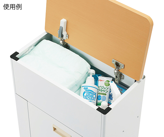 ●約7人分の用品を搭載できるので、夜間の連続おむつ交換なども楽に行えます。●キャスター・持ち手付きで移動がスムーズで静かです。●上段におむつや用品を収納でき、下段はごみを入れられるスペースになっています。●サイドのポケットは洗浄ボトル(シャワーボトル)等を入れることができます。●動かさない時は、トイレなどに置いて物入れやゴミ箱として使用可能です。●サイズ(mm):485×260×895●重量(kg):12●材質:本体/スチール、天板/ポリエステル化粧合板●天板サイズ:485×270mm●キャスター:Φ53.5mm(2輪ストッパー付き)●付属品:ゴミ箱(25L)●※洗浄ボトル(シャワーボトル)は付属しません。