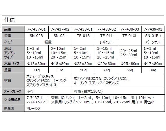 ●底面の穴にアンプルを差し込んでアンプルの先を折る構造のため、怪我のリスク低減が可能です。●折った先端は内部に収納され、上部のボタンを押して容易にアンプルの破片を捨てることが可能です。●★超軽量タイプで、持ち歩きに便利です。●机から転がり落ちにくいよう、六角形になっています。●Φ幅×全長(mm):Φ22×80●重量(g):13●材質:ボディ/プラスチック、Oリング/シリコン、キーリング・スプリング/ステンレス●適合アンプルサイズ:5~10mL・10~15mL・20~25mL●FDA承認済