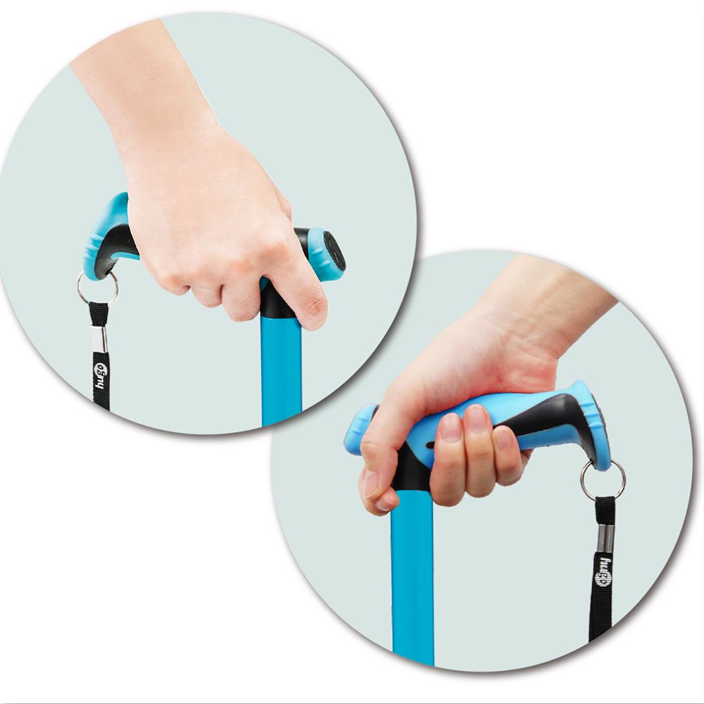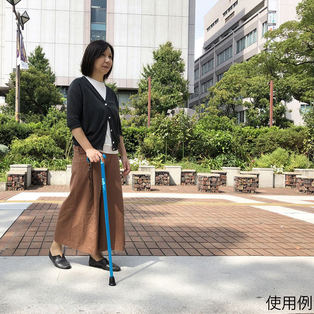 ●左右どちらでも握りやすいグリップ形状です。●クッション付きのグリップが手にかかる衝撃を和らげます。●杖先ゴムが裾広の形状で接地面への食いつきが良く、安定性に優れています。●色:ブルー●材質:シャフト/アルミニウム、グリップ/熱可塑性エラストマー(TPR)・PP(ポリプロピレン)、ストラップ/ナイロン、杖先/天然ゴム●全長:680~960mm(25mm間隔・12段階調整)●シャフト先端部径:Φ19mm●重量:395g●対応身長(目安):130~186cm