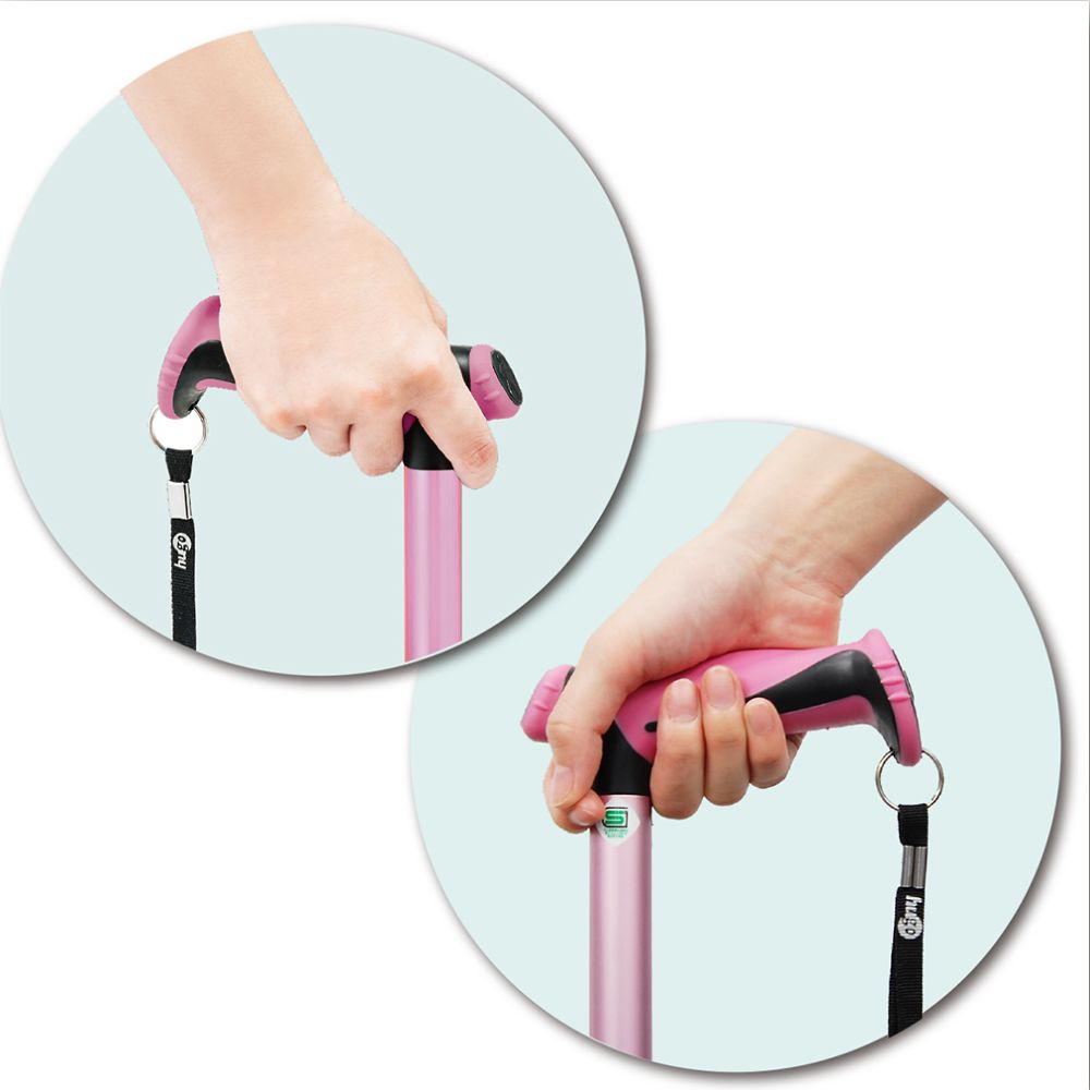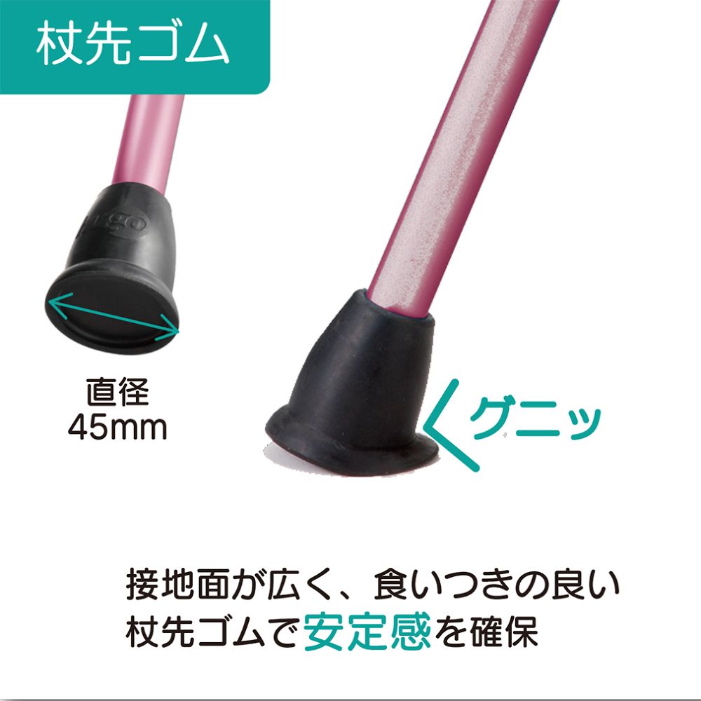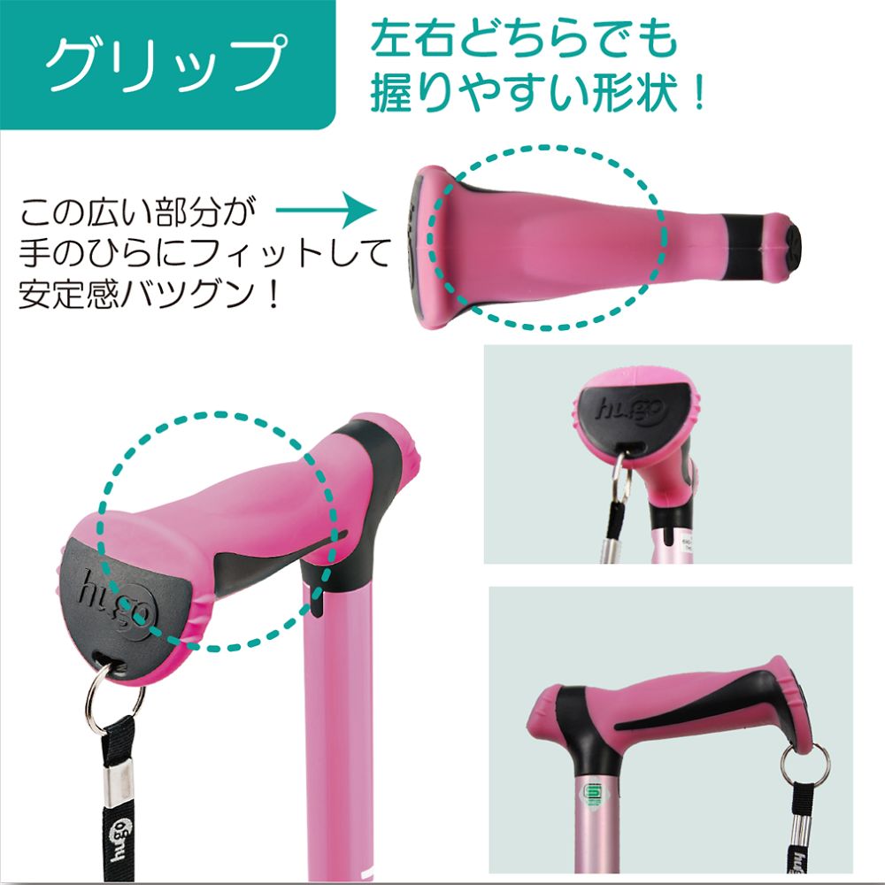 ●左右どちらでも握りやすいグリップ形状です。●クッション付きのグリップが手にかかる衝撃を和らげます。●杖先ゴムが裾広の形状で接地面への食いつきが良く、安定性に優れています。●色:ピンク●材質:シャフト/アルミニウム、グリップ/熱可塑性エラストマー(TPR)・PP(ポリプロピレン)、ストラップ/ナイロン、杖先/天然ゴム●全長:680~960mm(25mm間隔・12段階調整)●シャフト先端部径:Φ19mm●重量:395g●対応身長(目安):130~186cm
