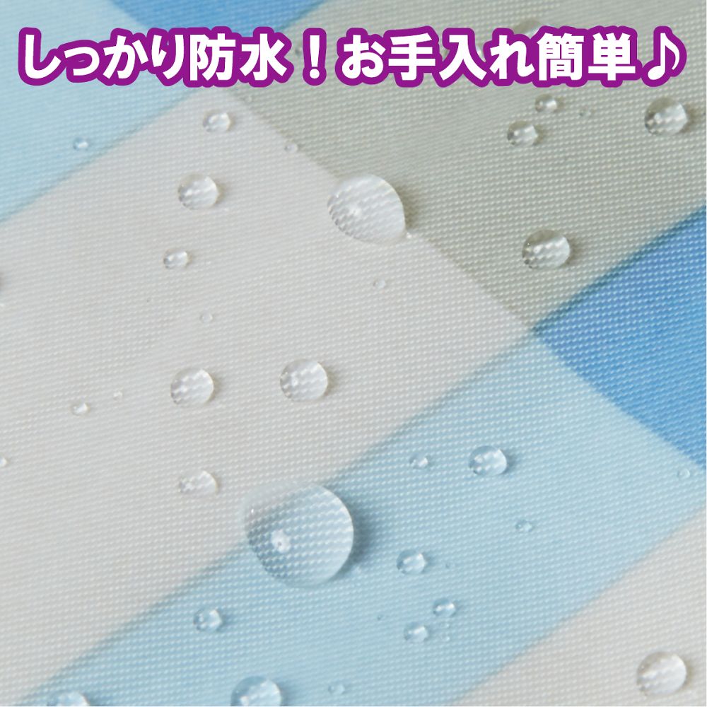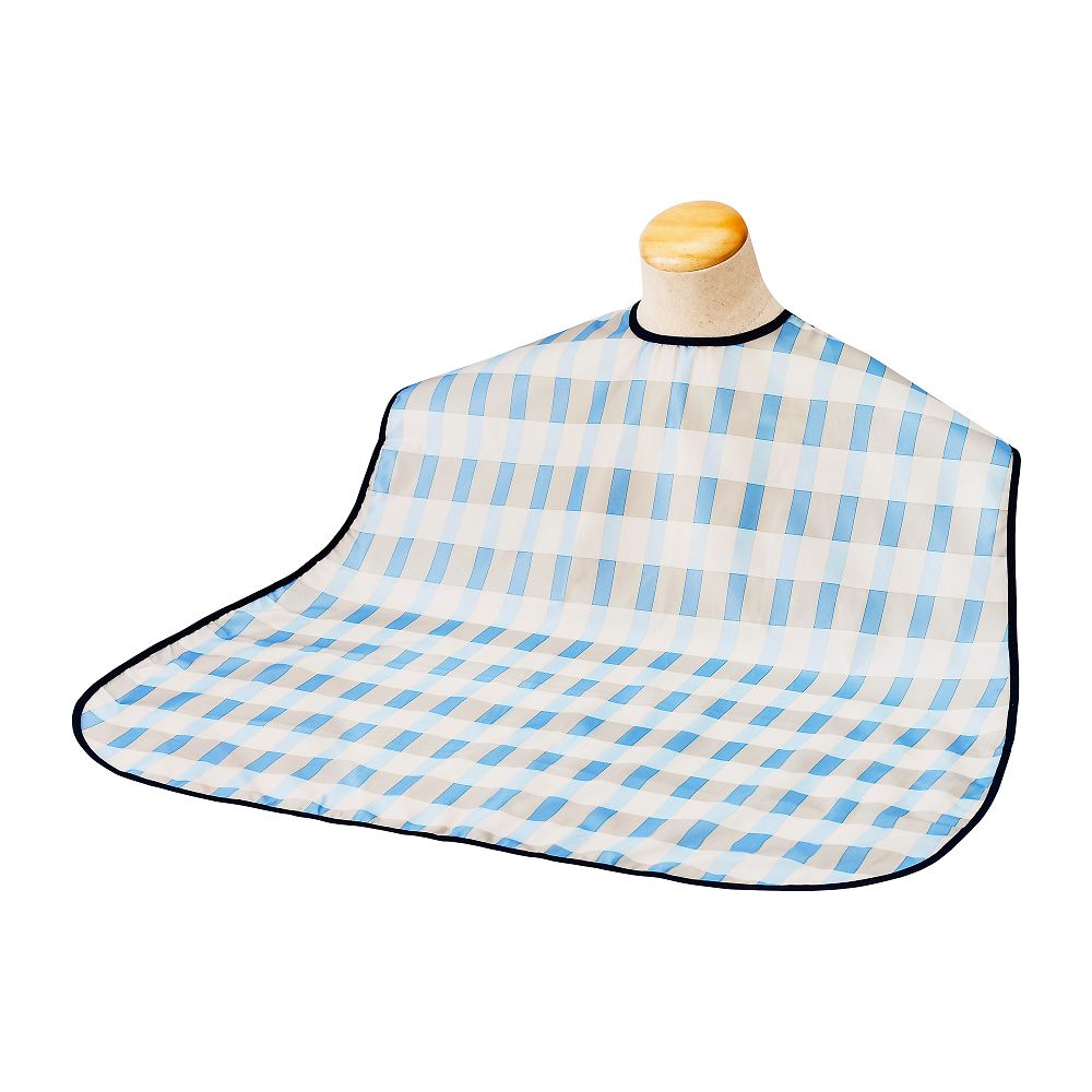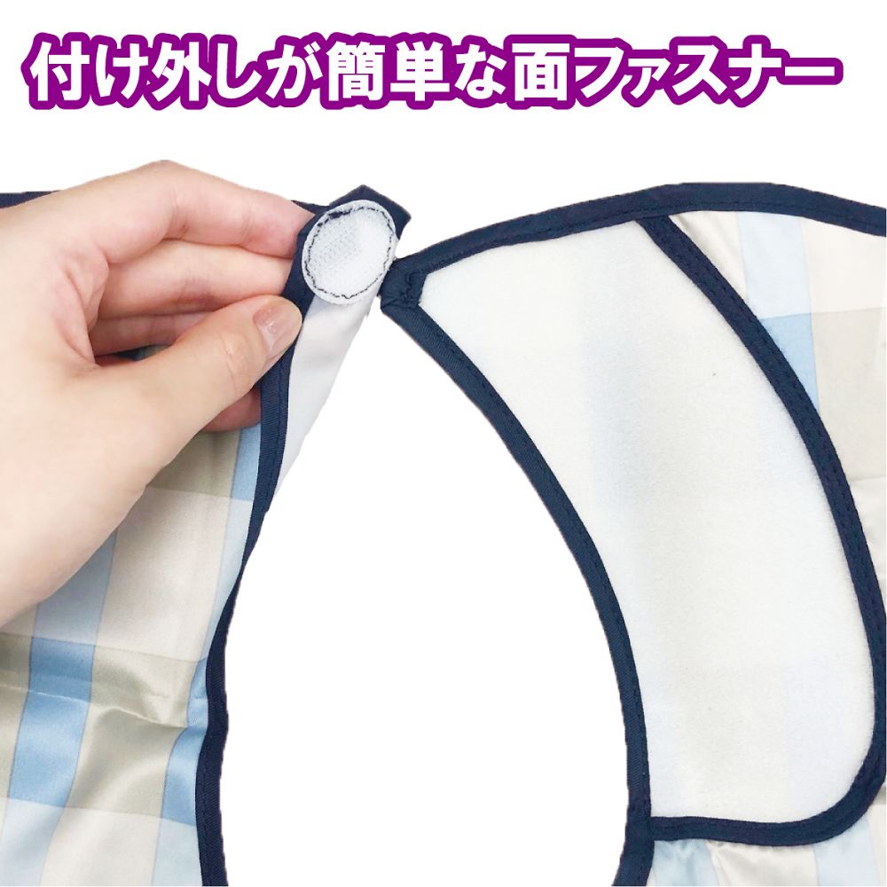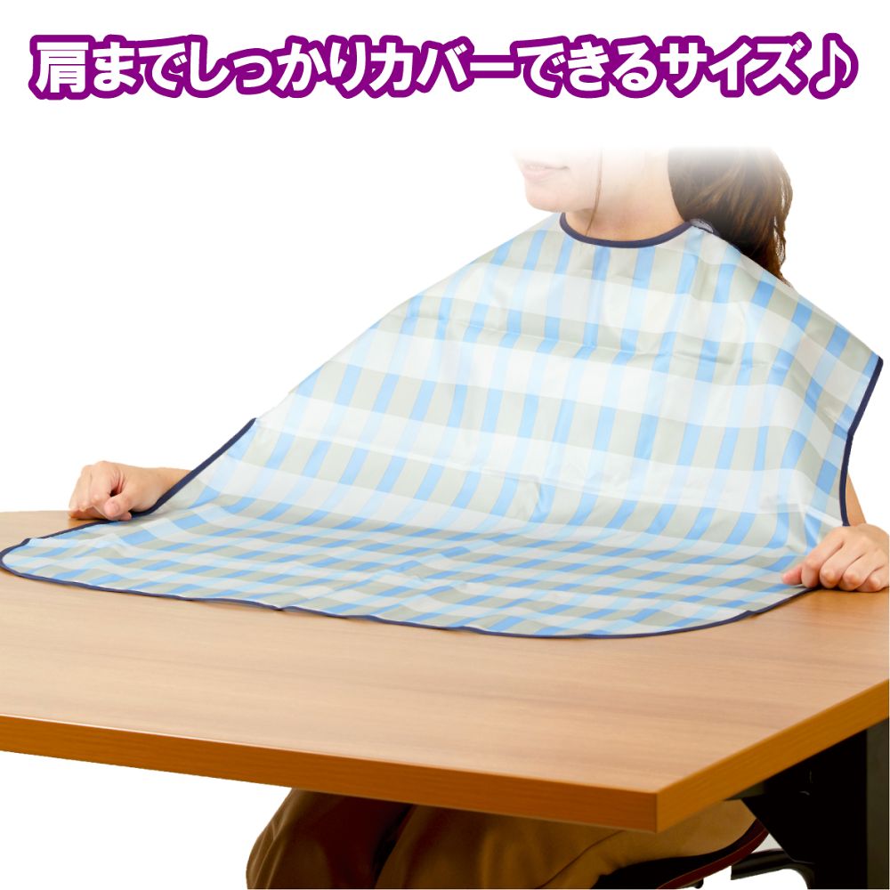 ●首まわりは面ファスナーで自由に調整可能です。●肩までしっかりカバーできます。●色:ブルー●材質:ポリエステル100%●幅×丈:750×900mm●首まわり:26~42cm●面ファスナー式●耐熱温度:120℃(アイロン)●洗濯方法:洗濯可/脱水機可/乾燥機可(60℃)●防水加工●撥水加工