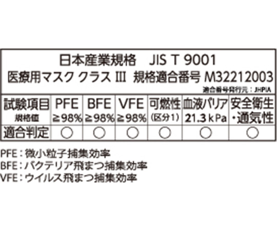 ●日本産業規格「JIS T 9001 医療用マスク クラスⅢ」に適合する防御性の高いサージカルマスクです。●サイズ(mm):175×95●入数:1箱(50枚入)●材質:PP(ポリプロピレン)不織布(3層構造)、ノーズクリップ/プラスチック●日本産業規格「JIS T 9001 医療用マスク クラスⅢ」適合●細菌ろ過効率(BFE):≧98%●微粒子ろ過効率(PFE):≧98%(0.1μm)●呼気抵抗(mmH2O/cm2):<5.0●液体防護性:160mmHg●燃焼性:クラス1●イヤーループタイプ:平ゴム(Φ3.5mm)●箱サイズ:110×90×240mm●ケース入数量:40箱