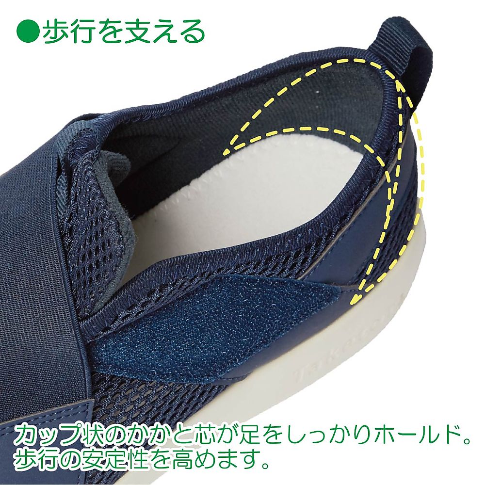 ●安定した歩行をサポートする室内外兼用シューズです。●普段履きにも使えるツートーンカラーのおしゃれでカジュアルなデザインです。●足幅4E、足囲3.5Eとゆったり設計で足のストレスを軽減し、中敷を取り外すと足囲も4Eに変更できます。●ベロの落ち込み予防に片側を縫い付けています。●間口がしっかり広がり足を入れやすく、両サイドのクロスストラップにより足としっかりフィットし、シューズ内部の足のズレを軽減します。●カップ状のかかと芯が足をしっかりホールドし、歩行の安定性をサポートします。●靴底には軽量で滑りにくい素材を採用しており、縦横に入った溝により、衝撃を吸収し動きやすいです。●色:ネイビー●サイズ(cm):25.0●材質:本体/ポリエステル、ストラップ/ポリエステル・ポリウレタン・合成ゴム、中敷/EVA・ポリエステル、面ファスナー/ナイロン、底面/EVA●参考足囲:25.7~26.1cm●重量:約170g(23.0cm片足)●室内用・室外用●マジック式
