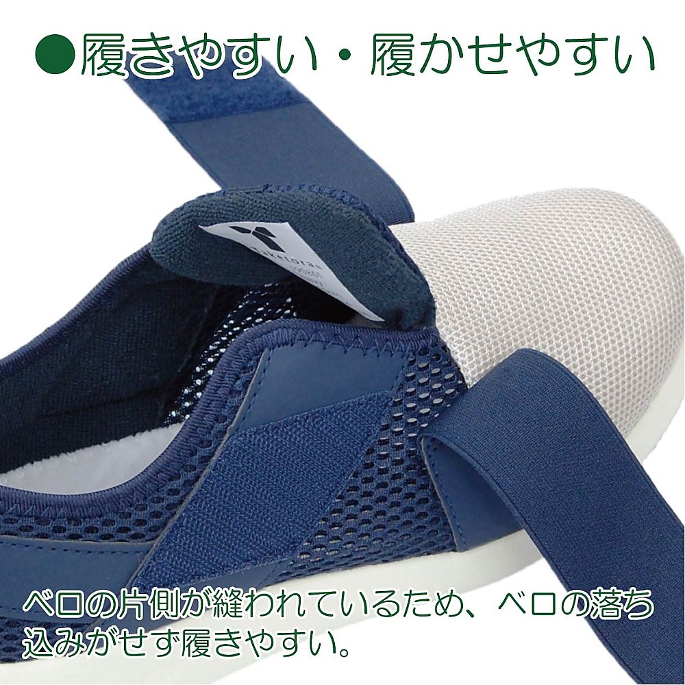 ●安定した歩行をサポートする室内外兼用シューズです。●普段履きにも使えるツートーンカラーのおしゃれでカジュアルなデザインです。●足幅4E、足囲3.5Eとゆったり設計で足のストレスを軽減し、中敷を取り外すと足囲も4Eに変更できます。●ベロの落ち込み予防に片側を縫い付けています。●間口がしっかり広がり足を入れやすく、両サイドのクロスストラップにより足としっかりフィットし、シューズ内部の足のズレを軽減します。●カップ状のかかと芯が足をしっかりホールドし、歩行の安定性をサポートします。●靴底には軽量で滑りにくい素材を採用しており、縦横に入った溝により、衝撃を吸収し動きやすいです。●色:ネイビー●サイズ(cm):28.0●材質:本体/ポリエステル、ストラップ/ポリエステル・ポリウレタン・合成ゴム、中敷/EVA・ポリエステル、面ファスナー/ナイロン、底面/EVA●参考足囲:27.5~27.9cm●重量:約170g(23.0cm片足)●室内用・室外用●マジック式
