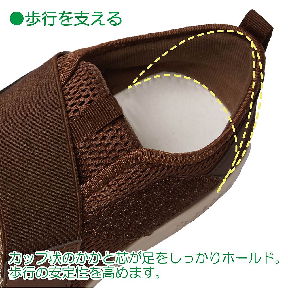 ●安定した歩行をサポートする室内外兼用シューズです。●普段履きにも使えるツートーンカラーのおしゃれでカジュアルなデザインです。●足幅4E、足囲3.5Eとゆったり設計で足のストレスを軽減し、中敷を取り外すと足囲も4Eに変更できます。●ベロの落ち込み予防に片側を縫い付けています。●間口がしっかり広がり足を入れやすく、両サイドのクロスストラップにより足としっかりフィットし、シューズ内部の足のズレを軽減します。●カップ状のかかと芯が足をしっかりホールドし、歩行の安定性をサポートします。●靴底には軽量で滑りにくい素材を採用しており、縦横に入った溝により、衝撃を吸収し動きやすいです。●色:ブラウン●サイズ(cm):23.0●材質:本体/ポリエステル、ストラップ/ポリエステル・ポリウレタン・合成ゴム、中敷/EVA・ポリエステル、面ファスナー/ナイロン、底面/EVA●参考足囲:24.5~24.9cm●重量:約170g(23.0cm片足)●室内用・室外用●マジック式