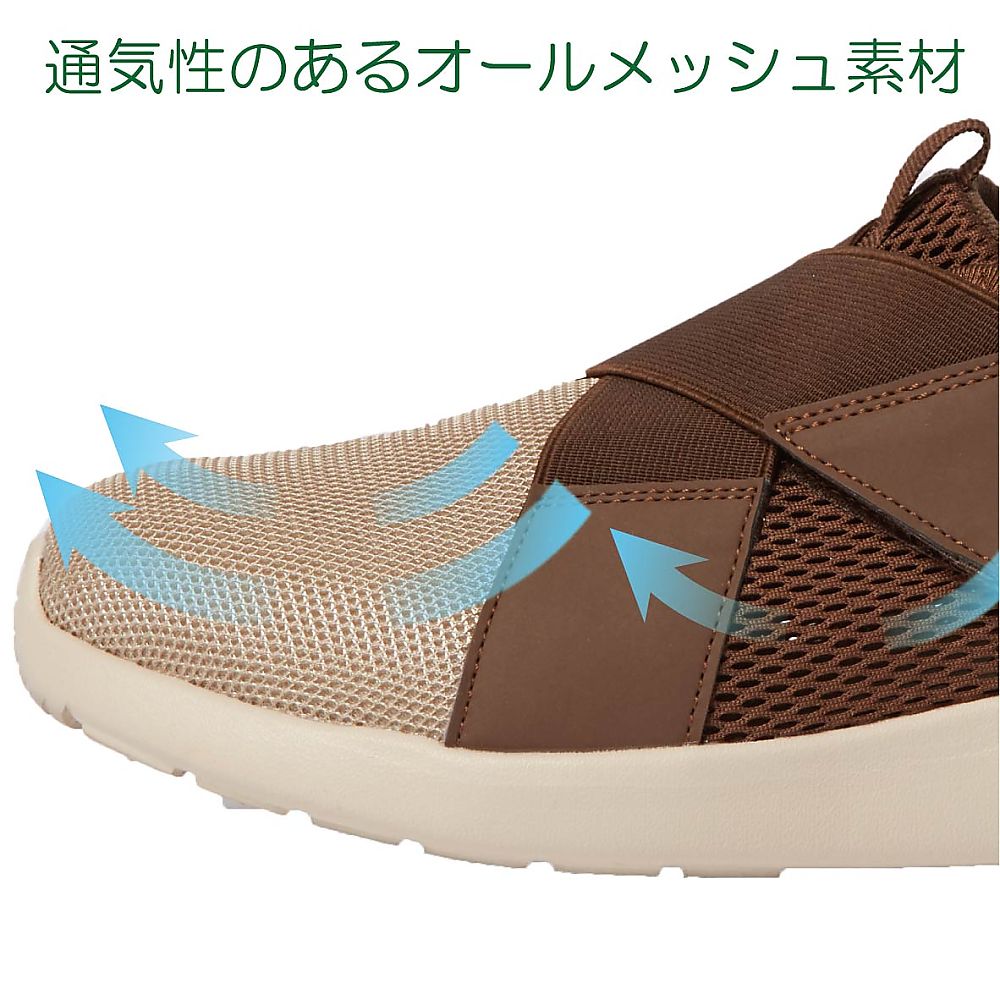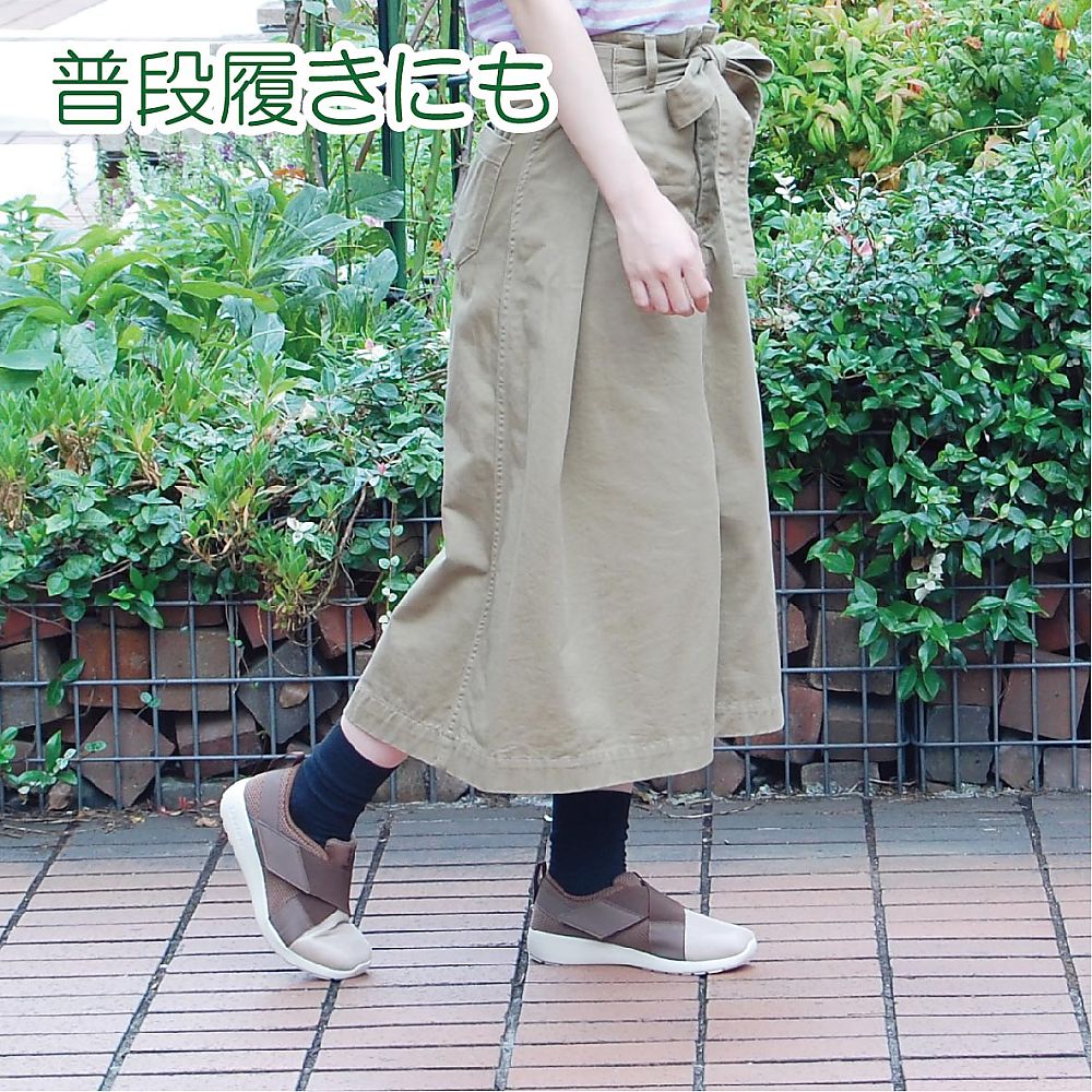 ●安定した歩行をサポートする室内外兼用シューズです。●普段履きにも使えるツートーンカラーのおしゃれでカジュアルなデザインです。●足幅4E、足囲3.5Eとゆったり設計で足のストレスを軽減し、中敷を取り外すと足囲も4Eに変更できます。●ベロの落ち込み予防に片側を縫い付けています。●間口がしっかり広がり足を入れやすく、両サイドのクロスストラップにより足としっかりフィットし、シューズ内部の足のズレを軽減します。●カップ状のかかと芯が足をしっかりホールドし、歩行の安定性をサポートします。●靴底には軽量で滑りにくい素材を採用しており、縦横に入った溝により、衝撃を吸収し動きやすいです。●色:ブラウン●サイズ(cm):26.0●材質:本体/ポリエステル、ストラップ/ポリエステル・ポリウレタン・合成ゴム、中敷/EVA・ポリエステル、面ファスナー/ナイロン、底面/EVA●参考足囲:26.3~26.7cm●重量:約170g(23.0cm片足)●室内用・室外用●マジック式