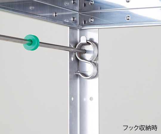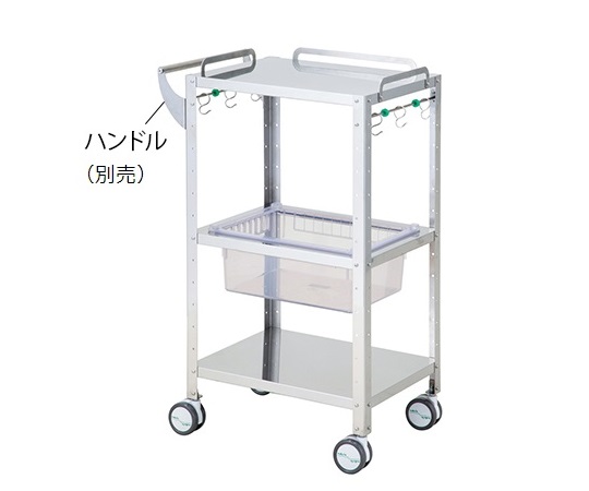 ●小回りが効き、PCカートとしても使用できます。●本体左右側面には、収納可能な移動式フックが各3箇所付いており、別途「フックで吊り下げ」商品や、ゴミ袋など任意で取りつけ出来ます。●中段にはアルティアトレーが入ります。●組み立て式で、棚板を任意の高さ(約52mmピッチ)で変更出来ます。●オプションのハンドル(別売)を取り付けると、回診車にもなります。●サイズ(mm):466×360×963●材質:本体/ステンレス(SUS304)、ハンドル/ステンレス(SUS430)、アルティアトレー/ABS樹脂(帯電防止剤入)●重量(トレー除く):約6.8kg●耐荷重:約20kg/段●対応トレー:アルティアハーフトレー●棚板有効寸法:462×356mm●棚間隔:約52mmピッチで調節可●三方手摺付●キャスター:双輪Φ100mmエラストマー製(4輪ストッパー付)●組み立て式(要工具)●ハンドル径:Φ25mm●付属品●▼アルティアハーフトレー(クリアホワイト・深型(品番:8-5866-18))×1枚、組立用ネジ、プラスドライバー●※サイズは三方手すり含まず。●交換用キャスター:ナビスキャスターΦ100 ネジ S有り(品番/8-2167-02-02)