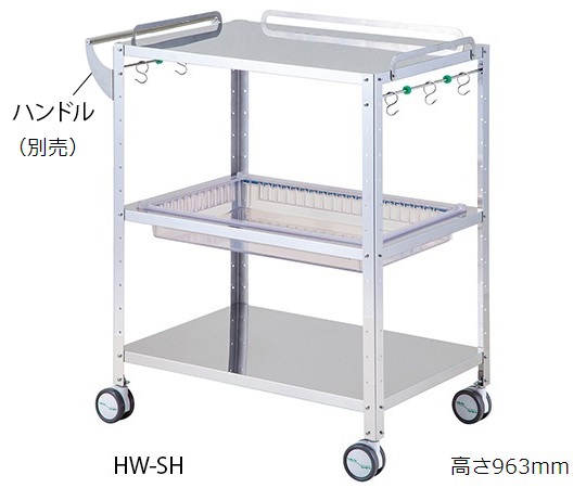 ●小回りが効き、PCカートとしても使用できます。●本体左右側面には、収納可能な移動式フックが各3箇所付いており、別途「フックで吊り下げ」商品や、ゴミ袋など任意で取りつけ出来ます。●中段にはアルティアトレーが入ります。●組み立て式で、棚板を任意の高さ(約52mmピッチ)で変更出来ます。●オプションのハンドル(別売)を取り付けると、回診車にもなります。●サイズ(mm):666×466×963●材質:本体/ステンレス(SUS304)、ハンドル/ステンレス(SUS430)、アルティアトレー/ABS樹脂(帯電防止剤入)●重量(トレー除く):約9.2kg●耐荷重:約20kg/段●対応トレーアルティアスタンダードトレー●棚板有効寸法662×462mm●棚間隔:約52mmピッチで調節可●三方手摺付●キャスター:双輪Φ100mmエラストマー製(4輪ストッパー付)●組み立て式(要工具)●ハンドル径:Φ25mm●付属品●▼アルティアスタンダードトレー(クリアホワイト・浅型(品番:0-5732-47))×1枚、組立用ネジ、プラスドライバー●※サイズは三方手すり含まず。●交換用キャスター:ナビスキャスターΦ100 ネジ S有り(品番/8-2167-02-02)