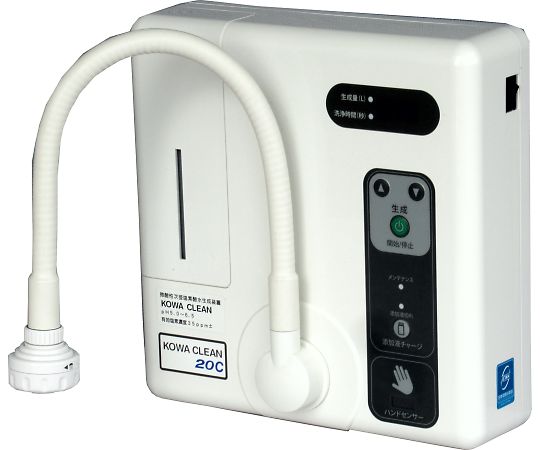 ●微酸性次亜塩素酸水のパワーで、除菌できるシステムです。●希釈不要ですぐに使えます。●小型・軽量でありながら、2.5L/分の生成能力をもっています。●非接触のハンドセンサーで開始・停止ができます。●サイズ(mm):270×80×270●重量(kg):約2.8●★入数:1個●作動水圧範囲:0.10~0.75MPa(推奨:0.20MPa以上)※0.75MPaを超える場合は必ず外部減圧弁を取り付けること。●生成水量:2.5L/分●添加液タンク容量:250mL(約200Lの生成が可能)●有効塩素濃度:約35(±10)ppm●電源:AC100V 50/60Hz 0.7A(消費電力:40W)●運転方式:ハンドセンサー(非接触式)、生成スイッチ●pH範囲:5.0~6.5●付属品:給水ホース(1.5m)、接続用チーズ、止水栓、専用添加液(1L)、クロール試験紙、測定用ミニカップ●※壁に取り付けて使用してください(裏面にビス穴を施しています)。●※別売の壁掛キット(7-8184-16)でも取り付けができます。