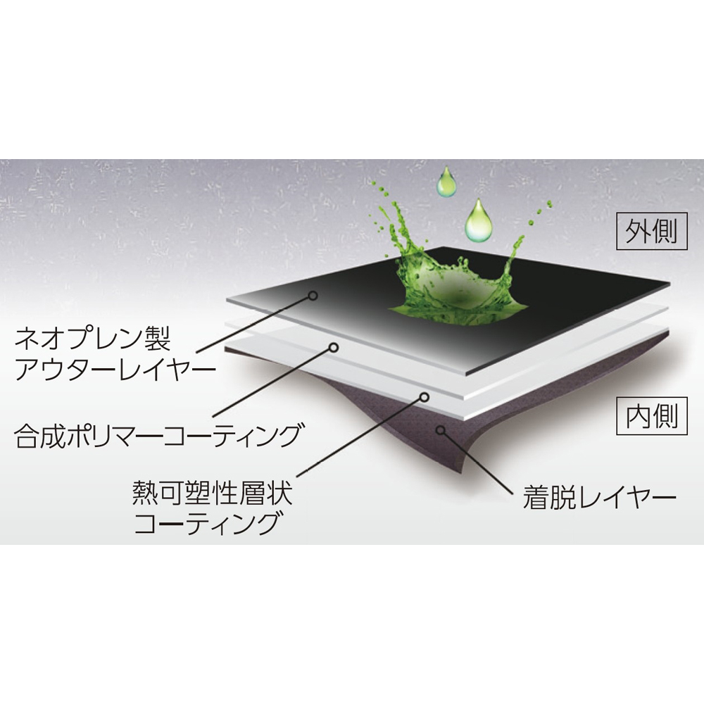 ●有機溶剤を取扱う作業に適しています。●それ以外の物質に対しても、優れた耐透過性能を有しているため、作業現場で複数の物質を取扱う場合も、重ねて手袋をつける必要がなく、手袋の交換の手間を軽減します。●薄手のため、より繊細な指の動きを実現します。●指先及び掌にエンボス加工を施し、滑りにくいです。●耐透過性試験データはこちら●試験データの記載がなかった物質は、下記、化学物質のリスクアセスメント専用問い合わせフォームをご利用ください。●JIS T 8116:2005適合品●裏地なし●材質:ネオプレン、ラミネートフィルム●サイズ:L(9号)●全長:350mm●中指の長さ:80mm●掌部の幅:119mm●質量(片手):54.8g●厚み:0.44mm●帯電防止加工●シリコーンフリー●ラテックスフリー