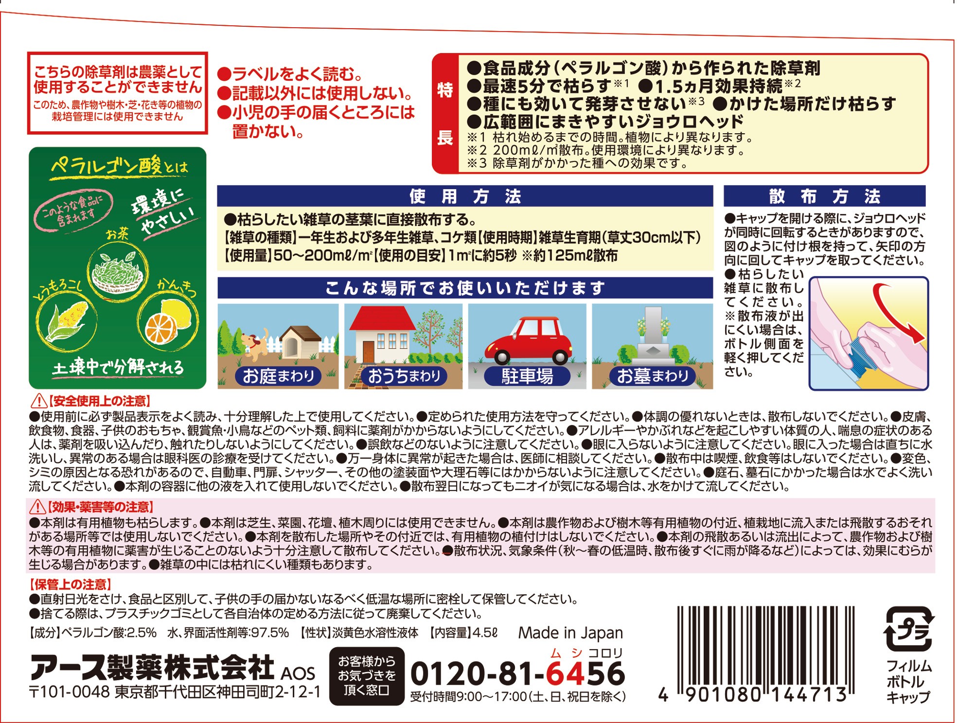 ●食品成分(ペラルゴン酸)から作られた除草剤●最速5分で枯らす●※枯れ始めるまでの時間。植物により異なります。●1.5ヶ月効果持続●※200mL/平方メートル散布。使用環境により異なります。●種にも効いて発芽させない●※除草剤がかかった種への効果です。●かけた場所だけ枯らす●広範囲にまきやすいジョウロヘッド●いやなニオイがしないほんのりハーブの香り●4.5L入(使用面積)約22から90平方メートル●【ペラルゴン酸とは】●▼食品にも含まれる成分のひとつで、土壌中で速やかに分解するので、環境に及ぼす影響は少ないです。(とうもろこし、お茶、かんきつなどの食品に含まれます。)●【性状】●▼淡黄色水溶性液体●※こちらの除草剤は農薬として使用することができません。このため、農作物や樹木・芝・花き等の植物の栽培管理には使用できません。●商品サイズ:幅/290mm、奥行/140mm、高さ/250mm●重量:5500g●内容量:4.5L●成分:ペラルゴン酸/2.5% 水、界面活性剤等:97.5%●香り:ほんのりハーブの香り