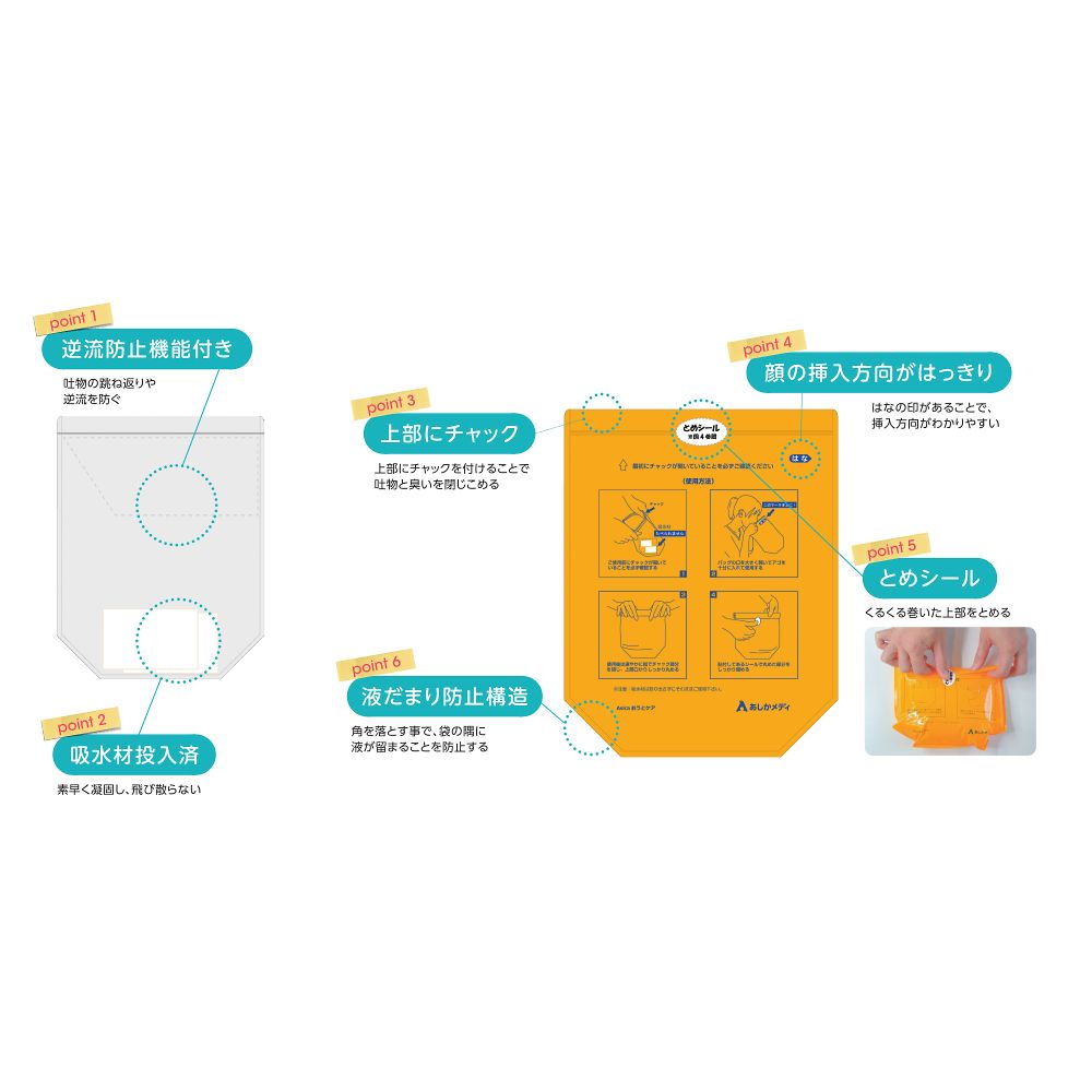 ●様々な場面で、嘔吐処理に使えるエチケット袋です。●二重構造の逆流防止機能により、吐物の跳ね返りや逆流を防ぎます。●吸水剤で吐物をすばやく凝固し飛び散らせません。●角を落とした液だまり防止構造により、袋の隅の液留まりを防止します。●上部にチャックにより、吐物と臭いを閉じこめます。●袋上部には顔の挿入口が分かりやすいハナの印がついています。●使用後は止めシールで丸めて廃棄することができます。●材質:ラミネートフィルム●色:オレンジ●サイズ:横240mm×縦300mm●容量:1,000mL