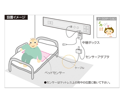 ●マットレスの上に敷くセンサーで、上体を起こした時にナースコールで知らせます。●センサー材質:PVC(塩化ビニル樹脂)●中継ボックスサイズ/50×75×30mm●ケーブル長:センサー/2.4m、中継ボックス/約1.2m(専用プラグ付)●重量:センサー/約600g、中継ボックス/約100g●防滴仕様