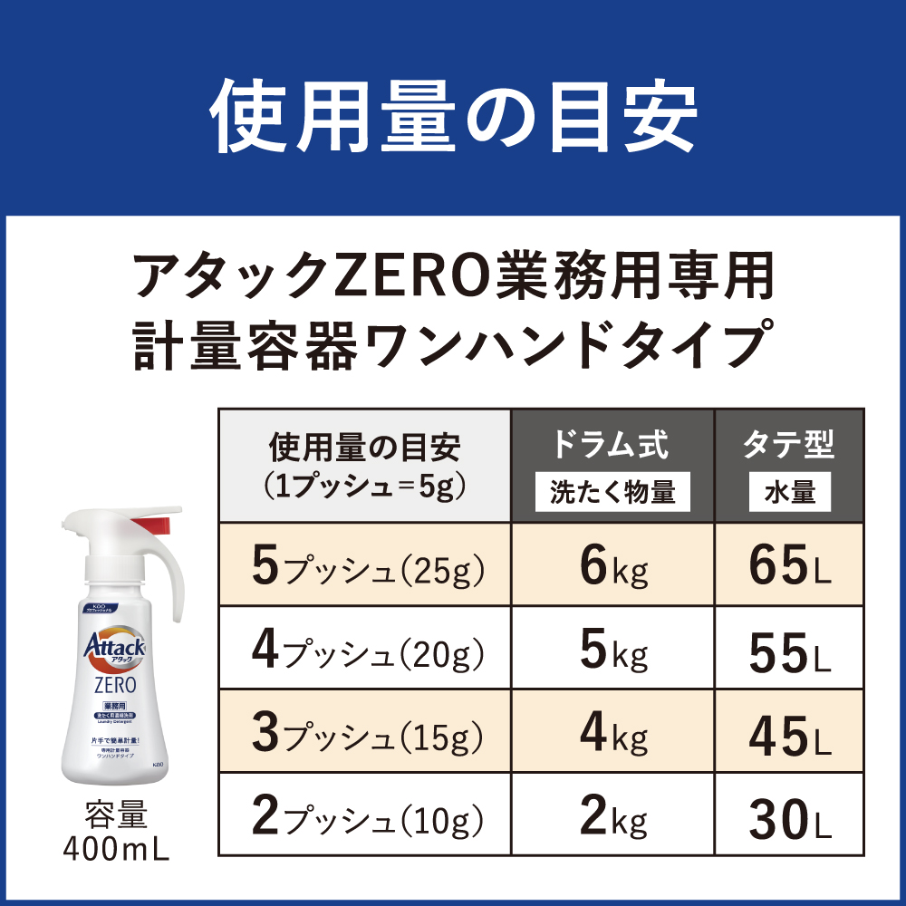 ●アタックZERO業務用専用の詰替え容器です。●片手で簡単に計量できます。●1プッシュ5gで洗濯物の量に合わせて洗剤の量を自由に調節できます。●※本品は空容器です。●容量:400mL●サイズ:95×78×210mm●重量:95g●※空容器です。