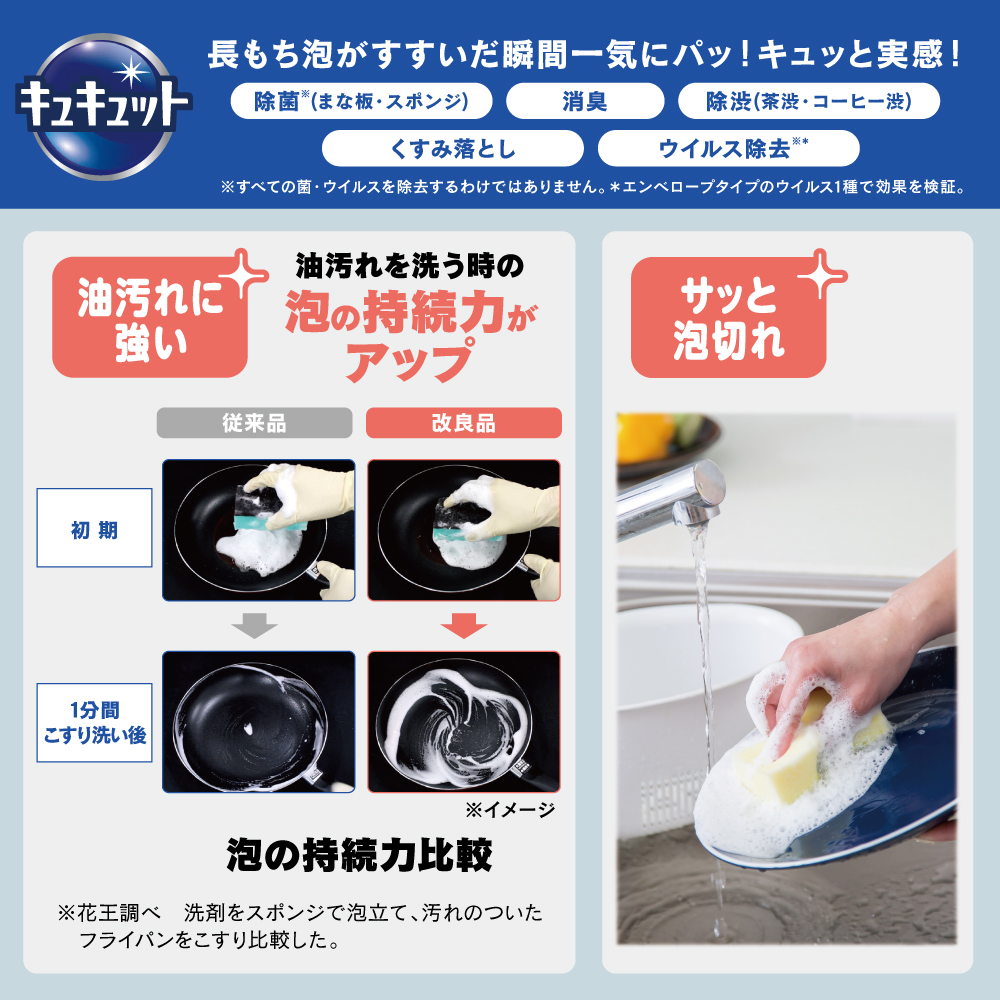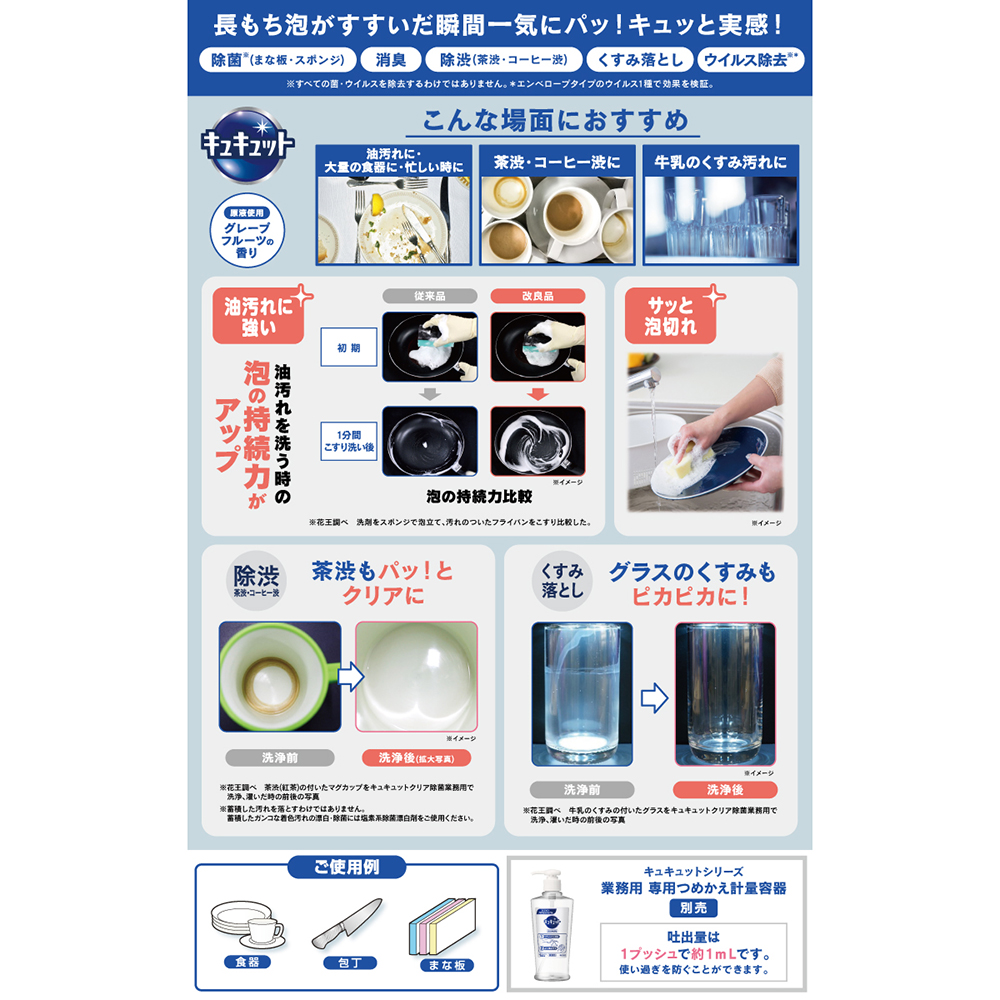 ●〔食器用洗剤〕●長もち泡がすすいだ瞬間一気にパッ!キュッと実感!●油汚れに強い。●こびりつき汚れへの洗浄力アップ!●サッと泡切れ。●手にやさしい。●除菌(まな板・スポンジ)、消臭、除渋(茶渋・コーヒー渋)、くすみ落とし、ウイルス除去(すべての菌・ウイルスを除去するわけではありません。エンベロープタイプのウイルス1種で効果を検証)。 ●原液使用。●グレープフルーツの香り。●用途:食器・調理用具、スポンジ・プラスチック製まな板(除菌)●容量:4.5L●液性:弱酸性●グレープフルーツの香り●成分:界面活性剤(33%、アルキルヒドロキシスルホベタイン、高級アルコール系(陰イオン))、安定化剤、除菌剤