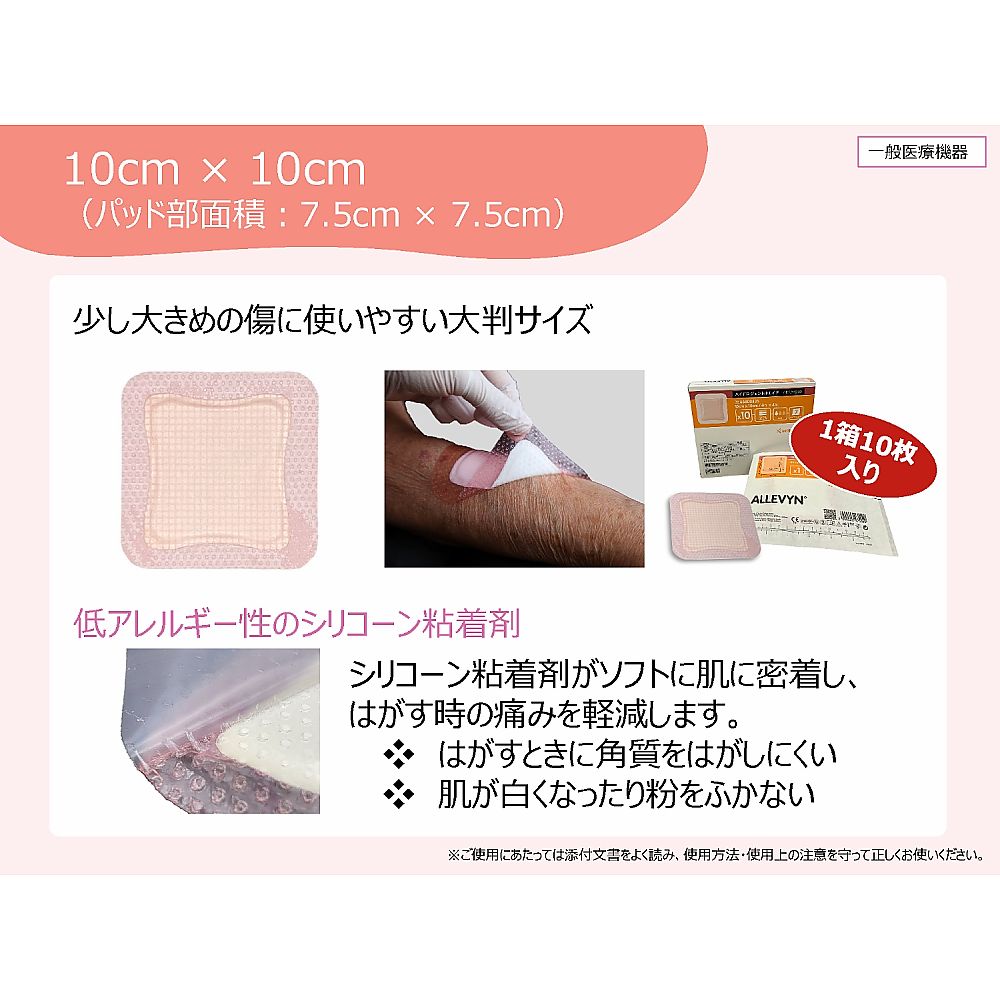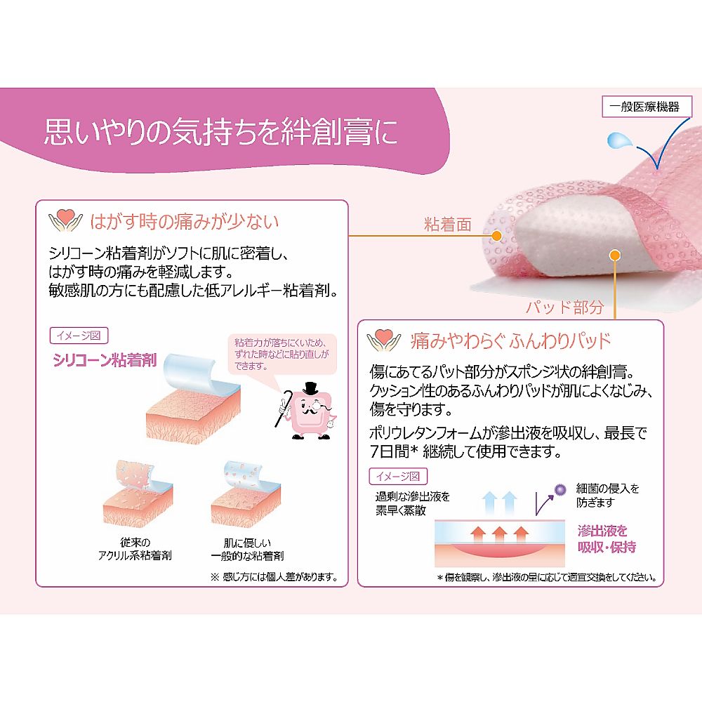 ●多くの病院で使用されている絆創膏です。●2mm厚ふんわりパッドが傷を守り液を吸収します。●最長7日間連続使用可能です。●シリコーンゲル粘着剤は、剥がす時の痛みが少なく、粘着力が落ちにくいため貼り直しができます。●薄くやわらかく部位にフィットします。●少し大きめの創傷に使いやすい大判サイズ●サイズ(mm):100×100●材質:基材/PU(ポリウレタン)、粘着剤/シリコン系●EOG滅菌(個包装)●入数:1箱(10枚入)●JMDNコード:34864000