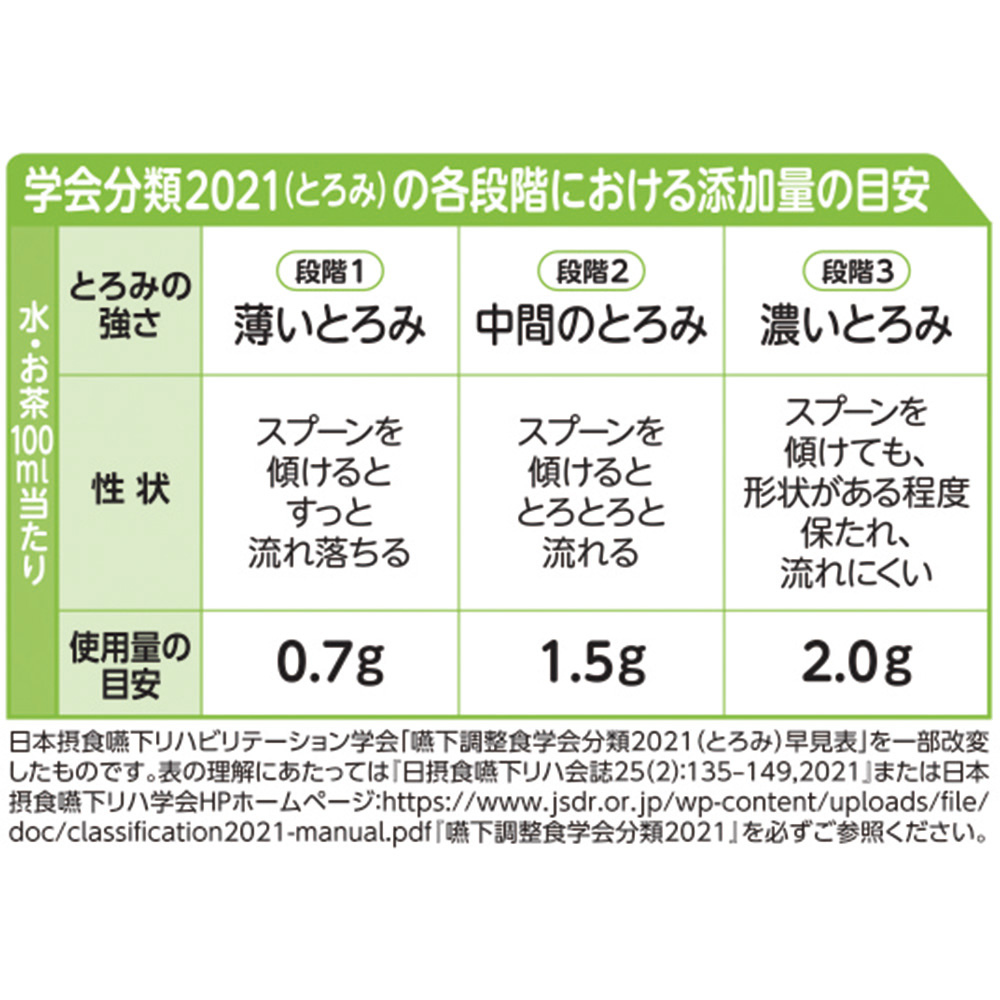 ●少量でトロミがつきます。●温かいものにも、冷たいものにもとろみをつけることができます。●入数:1袋(600g入)●原材料名:デキストリン・キサンタンガム・クエン酸三ナトリウム・乳酸カルシウム●とろみの目安(水・お茶100mL):薄いとろみ/0.7g、中間のとろみ/1.5g、濃いとろみ/2.0g●栄養成分(100*g*当たり):エネルギー/342*kcal*、たんぱく質/0.6*g*、脂質/0*g*、炭水化物/85.0*g*、食塩相当量/3.8*g*(※食塩相当量(*g*)=ナトリウム(*mg*)×2.54×1/1000)※軽減税率マークのついている商品は軽減税率の対象です。