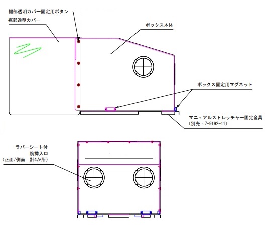 ●マニュアルストレッチャーにエアロゾルボックスを設置できます(別売の固定金具(7-9192-11)を使用)。●病室などのベッドにも使用可能です。●別売の裾部軟質PVC(7-9192-12)を使用しますと、隙間を最小限にすることが可能です。●サイズ:W580×D700×H500mm●材質:本体/硬質PVC、フード部/軟質PVC●HEPAフィルター無し●フードサイズ:580×700×500mm●取付け可能機種:マニュアルストレッチャーCNO-02N(8-5163-41)、CNO-03N(8-5163-71)