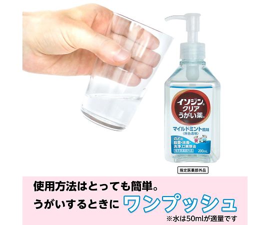 ●無色透明なので洗面台や衣類が汚れることがありません。●のどのバイ菌を殺菌・消毒します。●容量(mL):200●成分・分量(100mL中):セチルピリジニウム塩化物水和物250mg、グリチルリチン酸二カリウム250mg●使用方法:1回約1mLを約50mLの水に薄めてうがいしてください。●指定医薬部外品●※PVPI(ポピドンヨード)は含まれておりません。