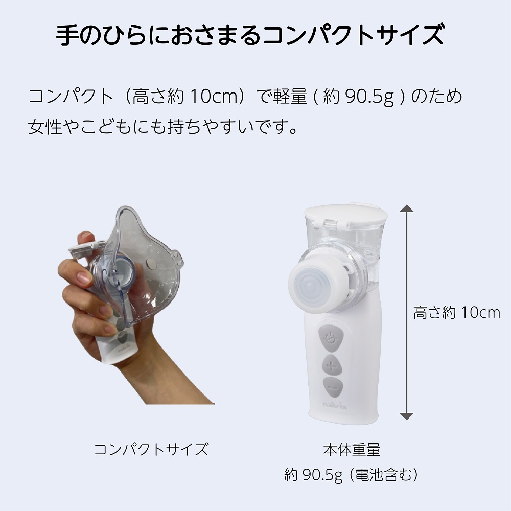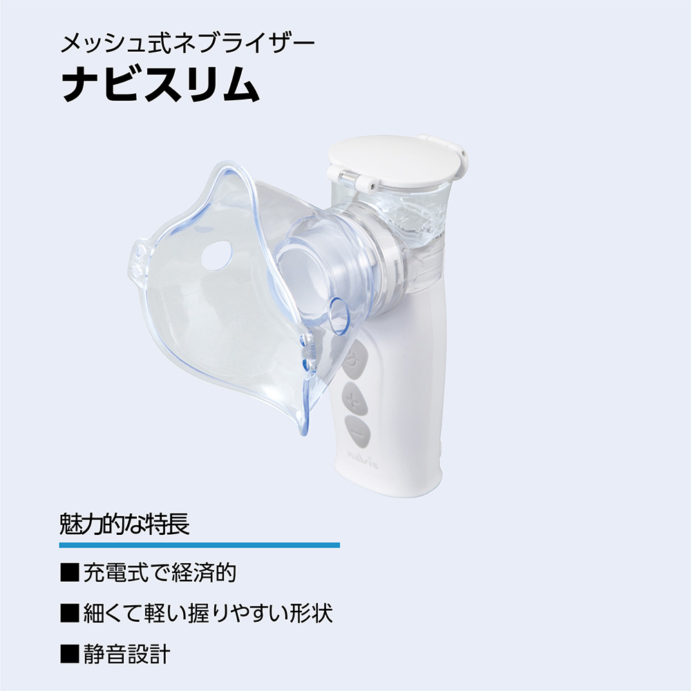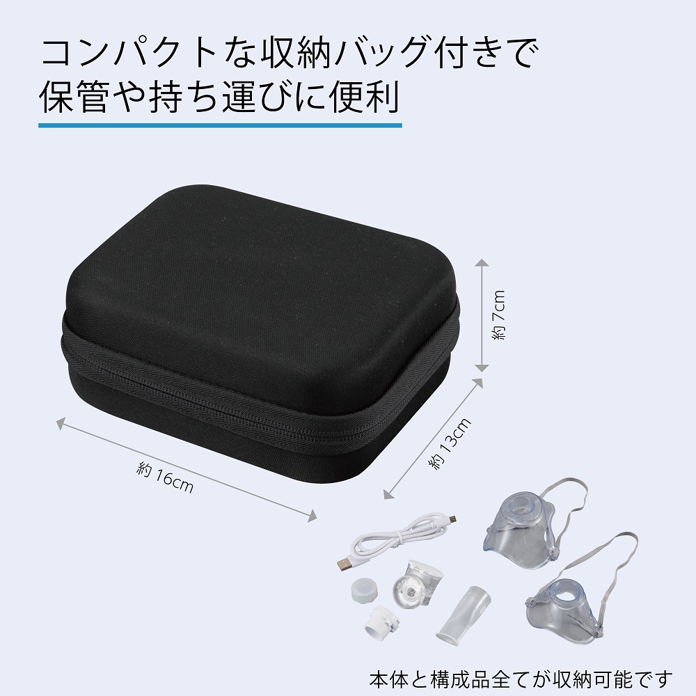 ●軽くて小児にも握りやすいメッシュ式ネブライザーです。●平均粒子径が細かいため下気道に効率よく吸入薬液が沈着します。●噴霧流量は3段階(弱/約0.24mL/min、中/約0.32mL/min、強/約0.51mL/min)から選べます。●コンパクトな専用ケース付きのため、持ち運びにも便利です。●リチウムイオン電池タイプですので電池交換が不要であり、ランニングコストを抑えられます。●メッシュモジュールのみの交換ができ、経済的です。(メッシュモジュールは消耗品です。)●仕様:本体セット●材質:本体/ABS樹脂、マウスピース/PP(ポリプロピレン)、小児用・大人用マスク/PVC(塩化ビニル樹脂)●噴霧方式:メッシュ式●噴霧粒子径:約3.5um●噴霧能力:約0.15~0.75mL/min●薬液残量:0.3mL以下●薬液ボトル容量:6mL●粘性の高い薬液への適合性:△●重量:約90.5g(リチウムイオン電池含む)●電源:リチウムイオン電池(付属のUSBケーブルで充電)●フル充電時稼働時間:60分●消費電力:<4W●本体サイズ:60×41×104mm●付属品:マウスピース、小児用マスク、大人用マスク、キャップ、薬液カップ、メッシュモジュール×2個、USBケーブル、収納用ケース●一般医療機器です。●※USB充電器は付属していないため、別途ご用意ください。