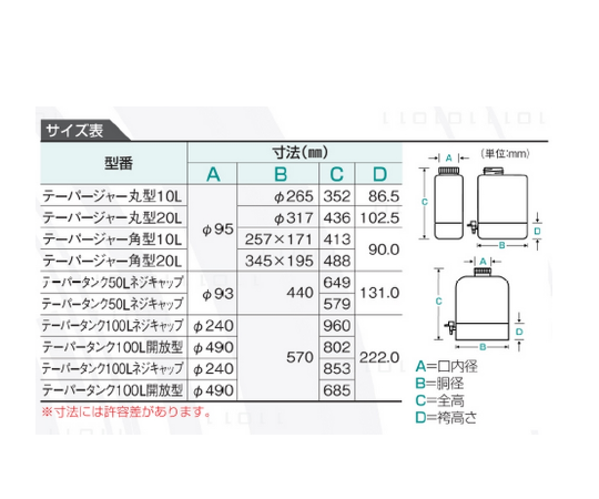 ●底部が傾斜構造ですので液残りがありません。●材質:本体・ハカマ/高密度ポリエチレン(HDPE)、キャップ/PP、コック/ポリプロピレン(PP)●使用温度範囲:0~70℃●50L用コック(3209-09)付属●容量:50L●キャスター:無●口内径×胴径×全高(mm):φ93×φ440×579●袴高さ(mm):131●※寸法には許容差があります。●目盛なし