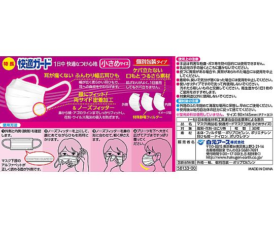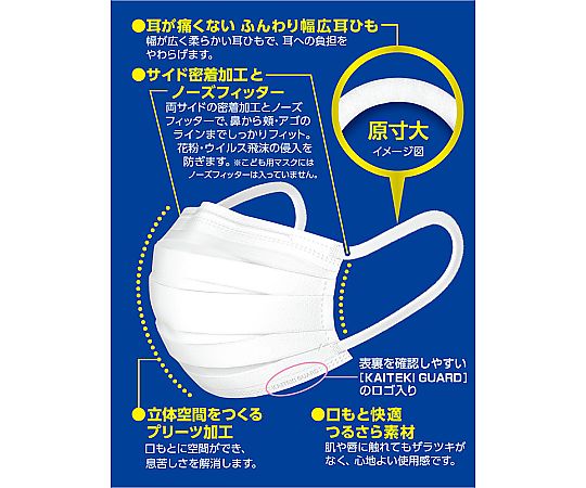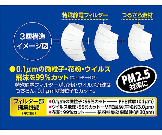 ●0.1μmの微小粒子カット不織布フィルターを採用しており、幅が広く柔らかい耳紐で、耳への負担を和らげます。●つるさら素材で肌や唇に触れてもザラつきがなく、心地よい使用感で口もとが快適です。●立体空間をつくるプリーツ加工で口もとに空間ができ、息苦しさを解消します。●両サイドの密着加工とノーズフィッターで、鼻から頬・アゴのラインまでしっかりフィットし、花粉・ウイルス飛沫の侵入を防ぎます。●仕様:小さめ●サイズ(mm):145×90●入数:1箱(1枚/袋×30袋入)●材質:本体・フィルタ部/ポリプロピレン・ポリエチレン、耳ひも部/ナイロン・ポリウレタン●ウイルスろ過率(VFE):99%(3μm)●微粒子ろ過効率(PFE):99%(0.1μm)●花粉ろ過効率:99%(30μm)