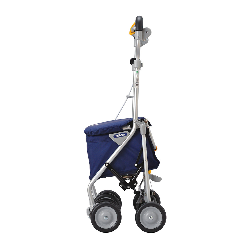 ●軽くて小さいコンパクトタイプで、小さく折りたため、持ち運びにも便利です。●持ち手は手が痛くなりにくいクッション素材を採用しています。●折りたたみはレバーの上下操作のみの簡単操作モデルです。●色:ネイビー●サイズ(mm):400×565×830~920●材質:本体/アルミニウム、バッグ/ナイロン●折りたたみ時サイズ:400×310×900mm●座面高:420mm●高さ調節:4段階(830・860・890・920mm)●キャスター:前輪/Φ約125mm(直進・左右40度・360度)、後輪/Φ約125mm●重量:3.7kg●耐荷重:100kg●バッグ載荷重:約10L(5kg)