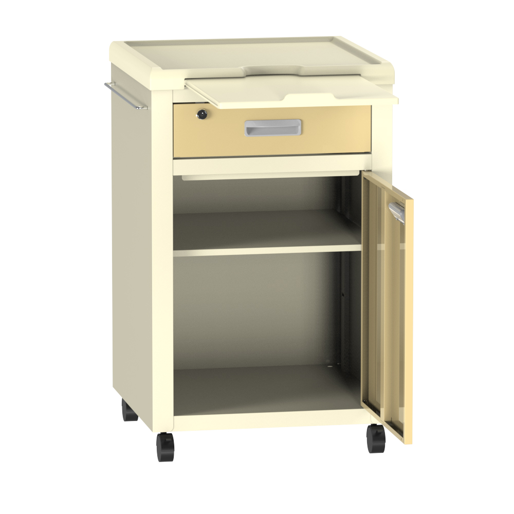 ●引出しは安心な鍵付きです。●作業面を広げられ収納式のテーブル付です。●色:クリーム●サイズ(mm):460×460×752●★入数:1個●材質:本体/スチール(粉体塗装)、天板・収納式テーブル/ABS樹脂、棚板/スチール●収納式テーブルサイズ:330×258mm●収納式テーブル耐荷重:3kg●有効内寸法:378×439×452mm●キャスター:約Φ50mmナイロン製(前輪ストッパー付き)●重量:17.8kg●棚板×1枚付き●床頭台(しょうとうだい)